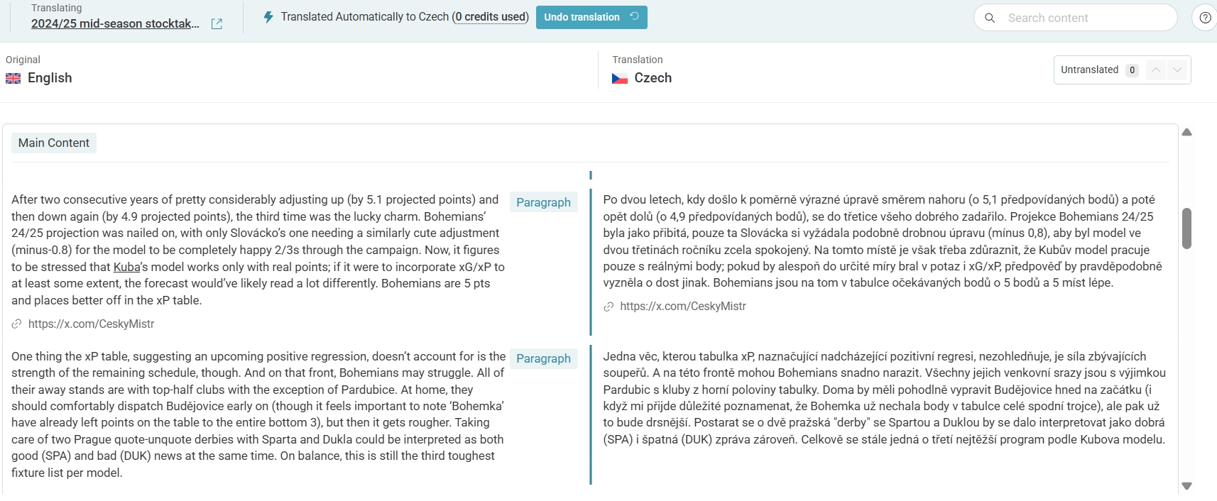 This is still a website designed primarily to suit English-speaking readers, so all Czech translations will only concern longform articles, and no piece will indeed be primarily written in Czech. For the translated versions to be a viable feature in the first place, I do need to use an automatic translation tool first — specifically DeepL-powered WPML plugin — only to then revise block by block in a neat editor looking like this. This tool, crucially, allows me to both A) save precious time inside the July and January crunch time, B) maintain some creative control over the text flow, tone etc. Thanks to this, you can expect as faithful a translation as possible, signed off on by no one else than the author himself. What you cannot expect is more information; just more of the same. Providing that alone is already time-consuming and costly, hence the need for the paywall — ultimately and definitively.