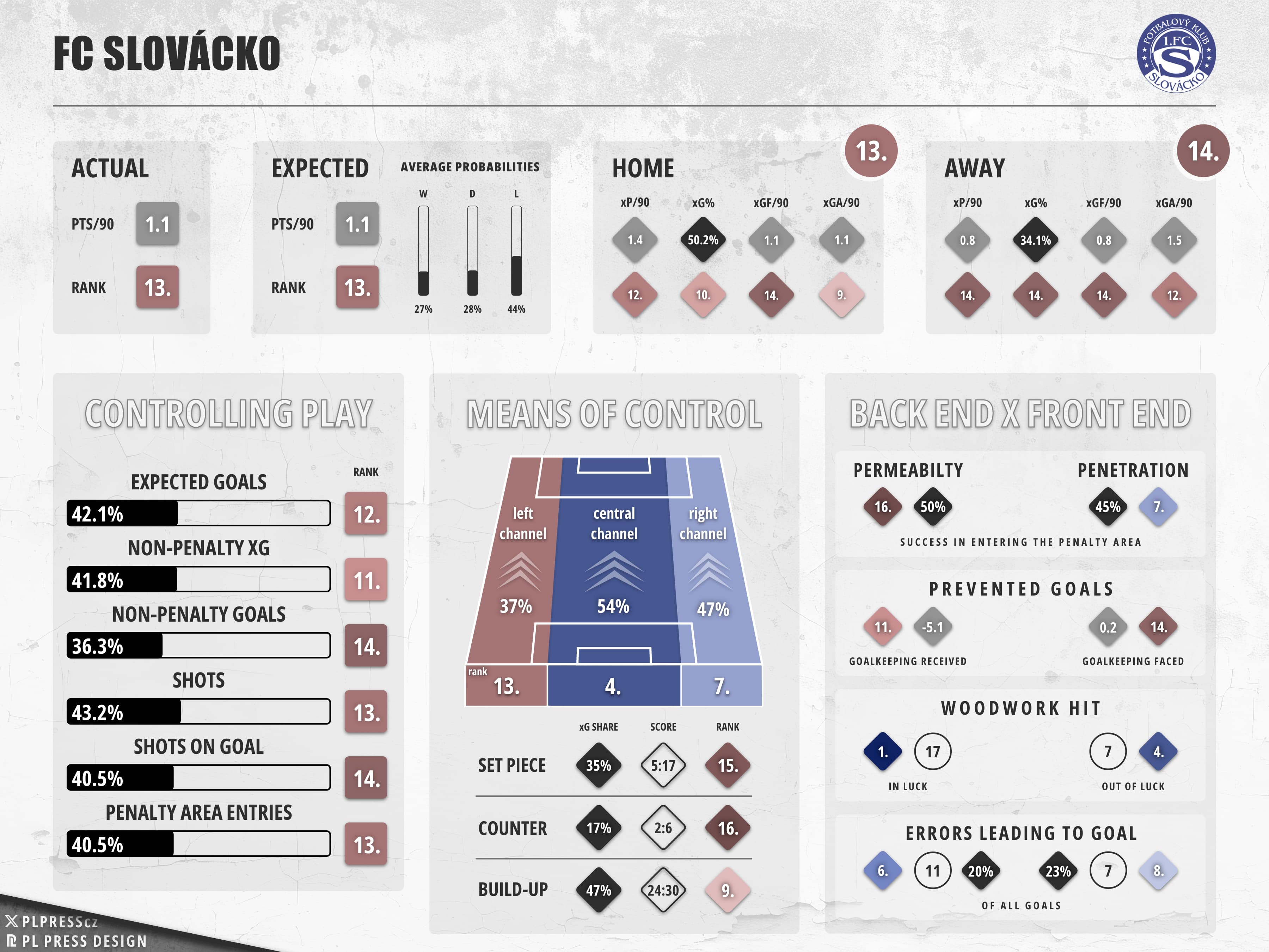 The juxtaposition to the (already underwhelming) tail end of Svědík’s era is generally damning. They exchanged a home xGFExpected Goals For (xGF) estimates how many goals a team should have scored based on shot quality, location, and context. average of 1.62 (5th best) for 1.09 (3rd worst), being responsible for a substantially less shot attempts now (9% down in shot share). Even more crucially, instead of having the set pieces largely figured out through a Top 4 xG share of 56.6%, they were now second-most clueless to the tune of 35% and as many as 17 goals leaked (only Dynamo did worse on both counts). They fouled a lot more deep down, too.