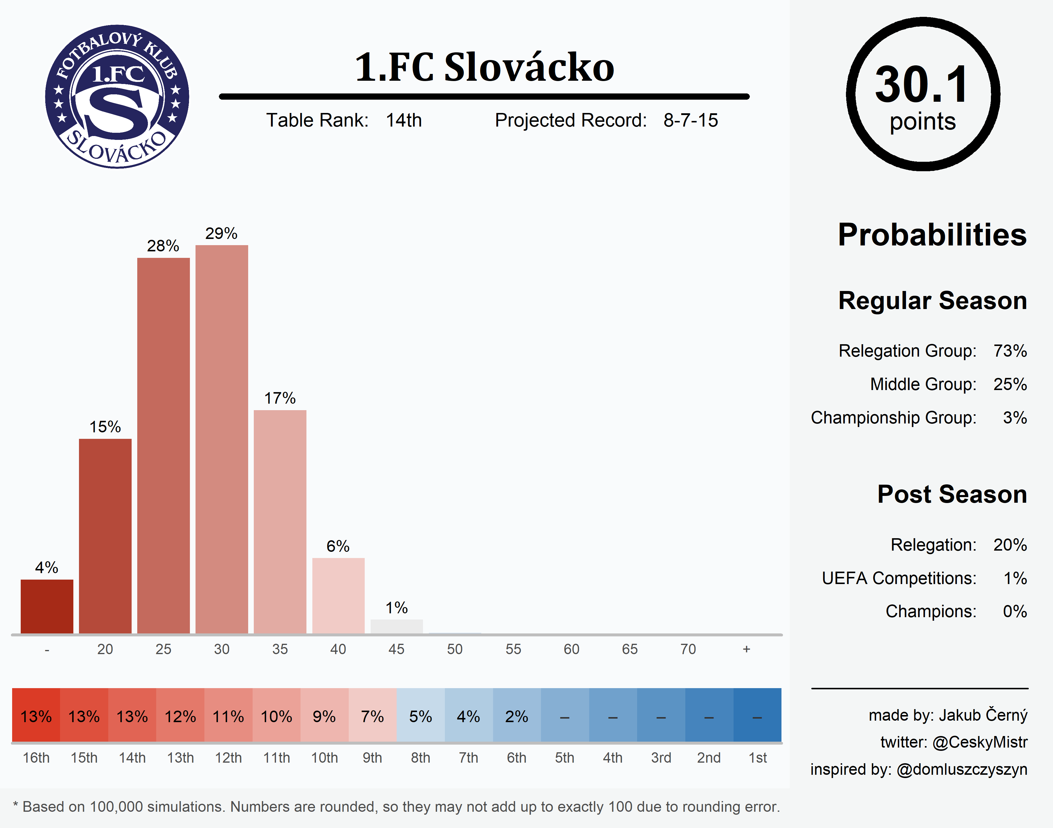 The fall has been every bit as rapid as it has been brutal. In summer 2023, Slovácko reached the lofty heights of a projected 49 regular-season points. Now, only two years later, they are pegged for 30. Even when their forecast came down to earth last summer (40 points), they were hardly considered relegation-threatened (1%) or even particularly likely to land in the relegation group (21%). Then both projections more or less came to pass, and here we have Slovácko as the third most likely team to go down and a near certainty to get stuck in the relegation battle. It’s funny to think back to January and recall the ever so slightly increased threat of forming the bottom six (27%) along with the substantially increased chance of falling into the calm middle (from 45% to 60%). Are we witnessing the model overcorrecting?