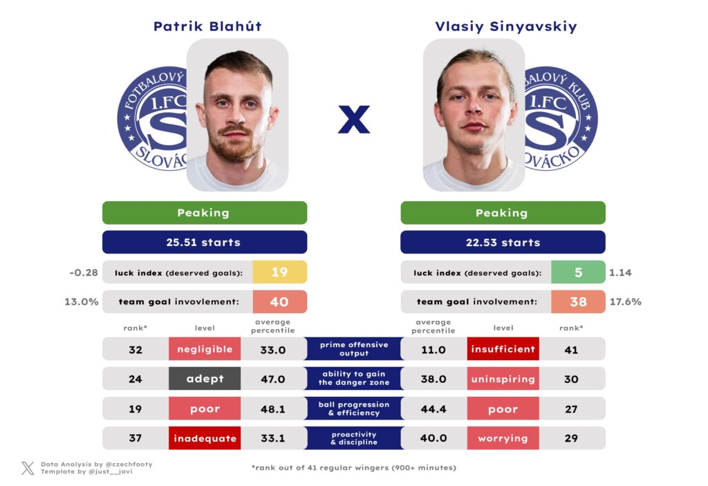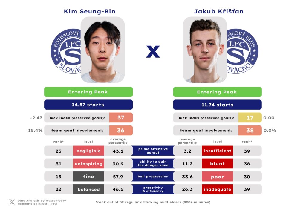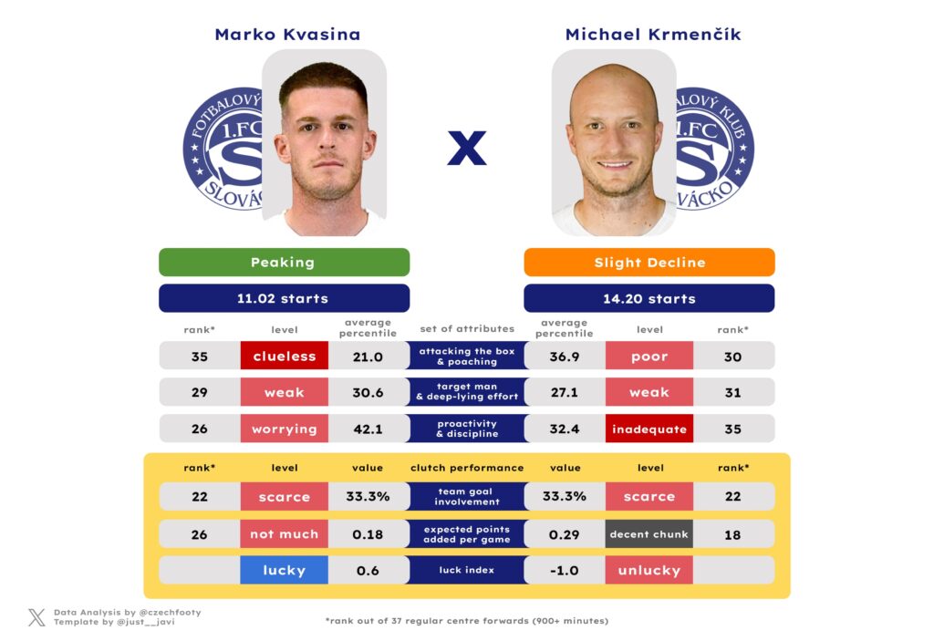 It’s been a long time since Filip Vecheta or Rigino Cicilia departed (leaving no mark on Slovácko’s 24/25 whatsoever), and it’s not like Jiří Klíma — let alone Matyáš Kozák — particularly hurt, either, but what you’re left with in the centre forward department are Marko Kvasina and Michael Krmenčík. And that won’t ever cut it. Even though Kozák and Klíma combined for an unspectacular 7 goal contributions, they all the same cut the collective contribution of all Slovácko CFs in half due to sheer ineptness of the two survivors.