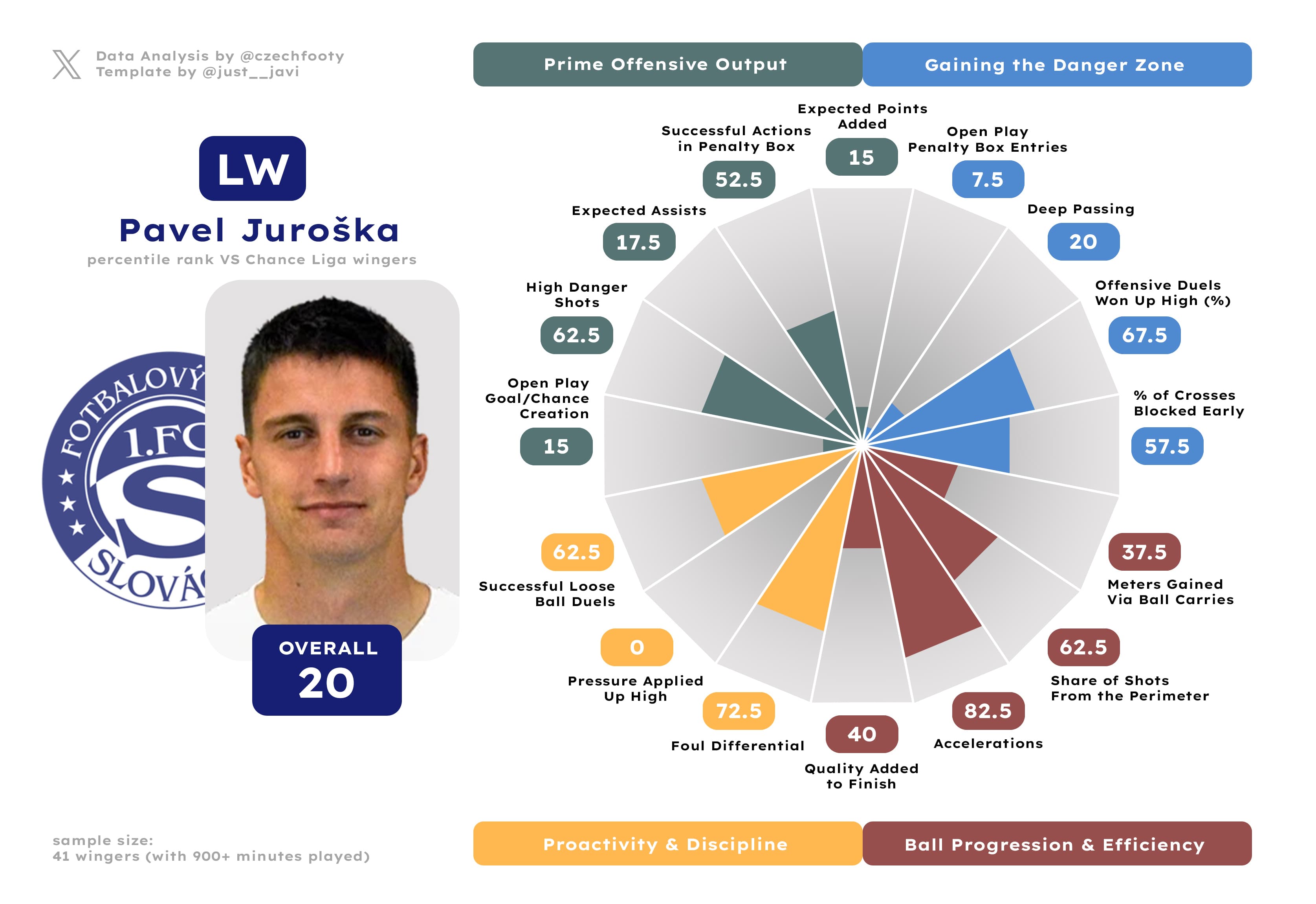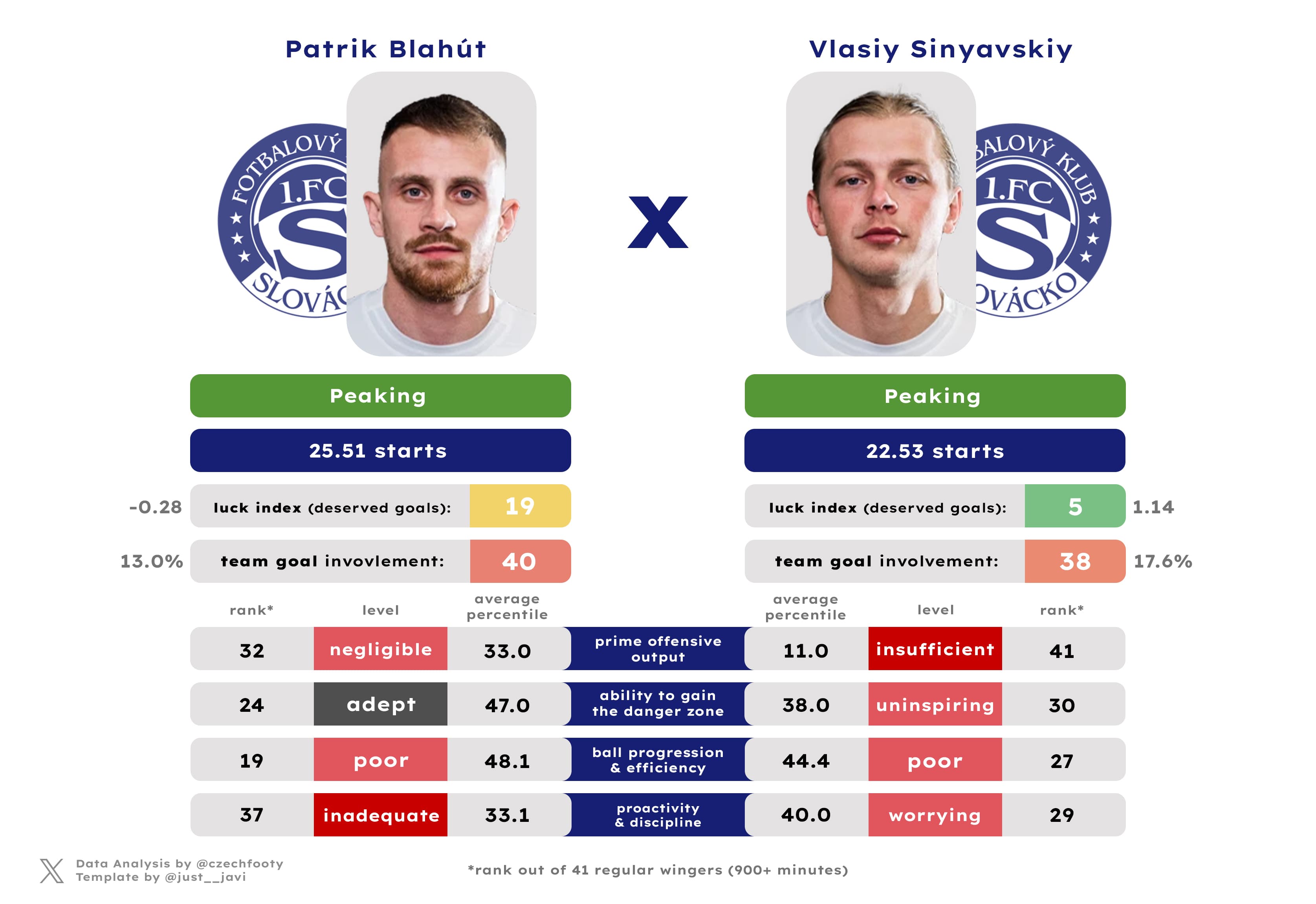 Last year, I had no choice but to run Patrik Blahút through my FB model after he arrived to Uherské Hradiště primarily as a winger. This time around, he was deployed right where he should be… only to provide much of the same. Run, dribble, bump into the wall or draw a foul. Rinse and repeat. That’s what Blahút is all about, and while it’s not completely without its value, it’s also arguably not enough. Similar to Ndefe, only one winger was less involved in goals scored with him on the pitch (Dominik Pleštil) and it’s ultimately no surprise only two teams managed less xGF per 90 down the right from positional attacks than Slovácko.
