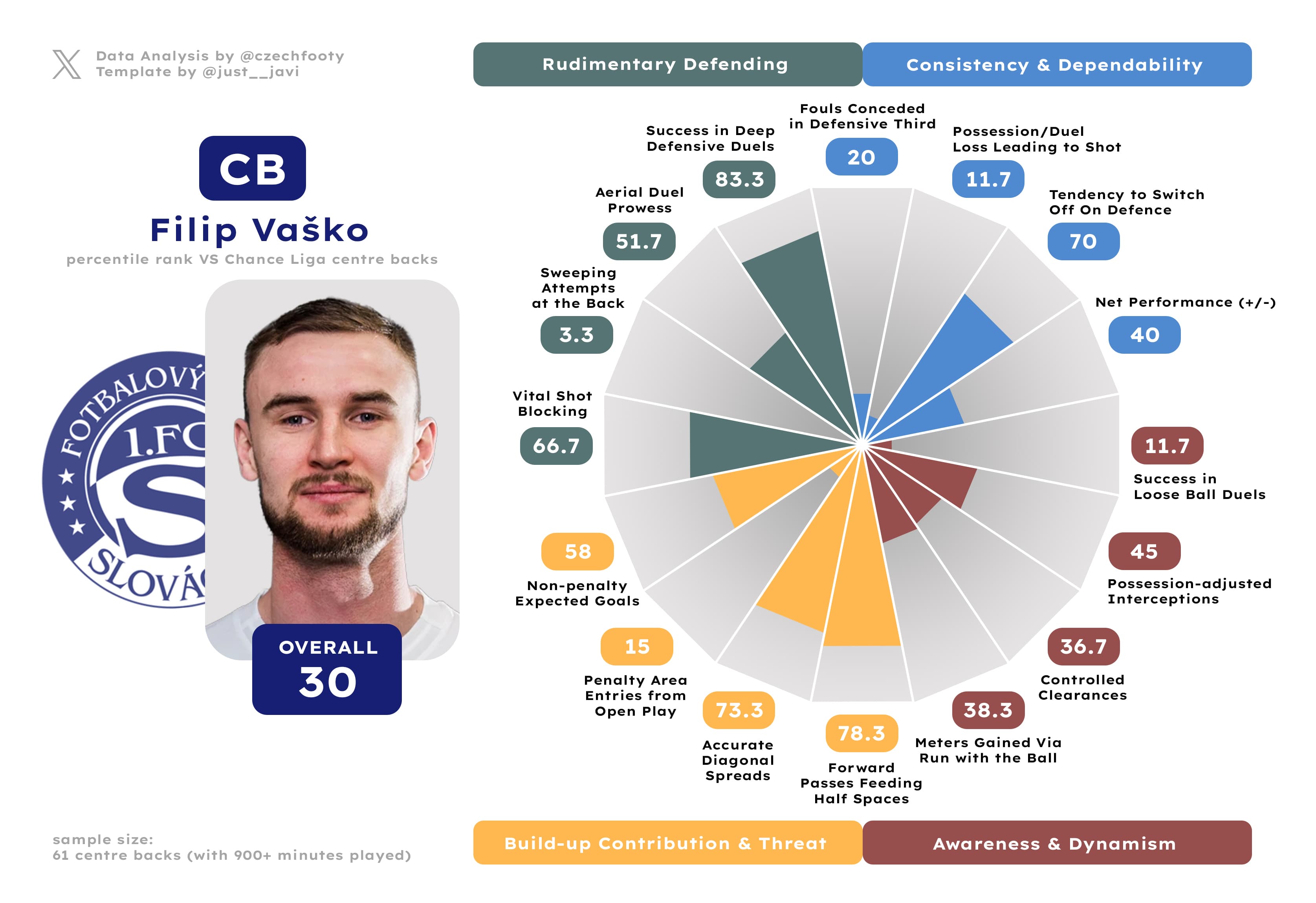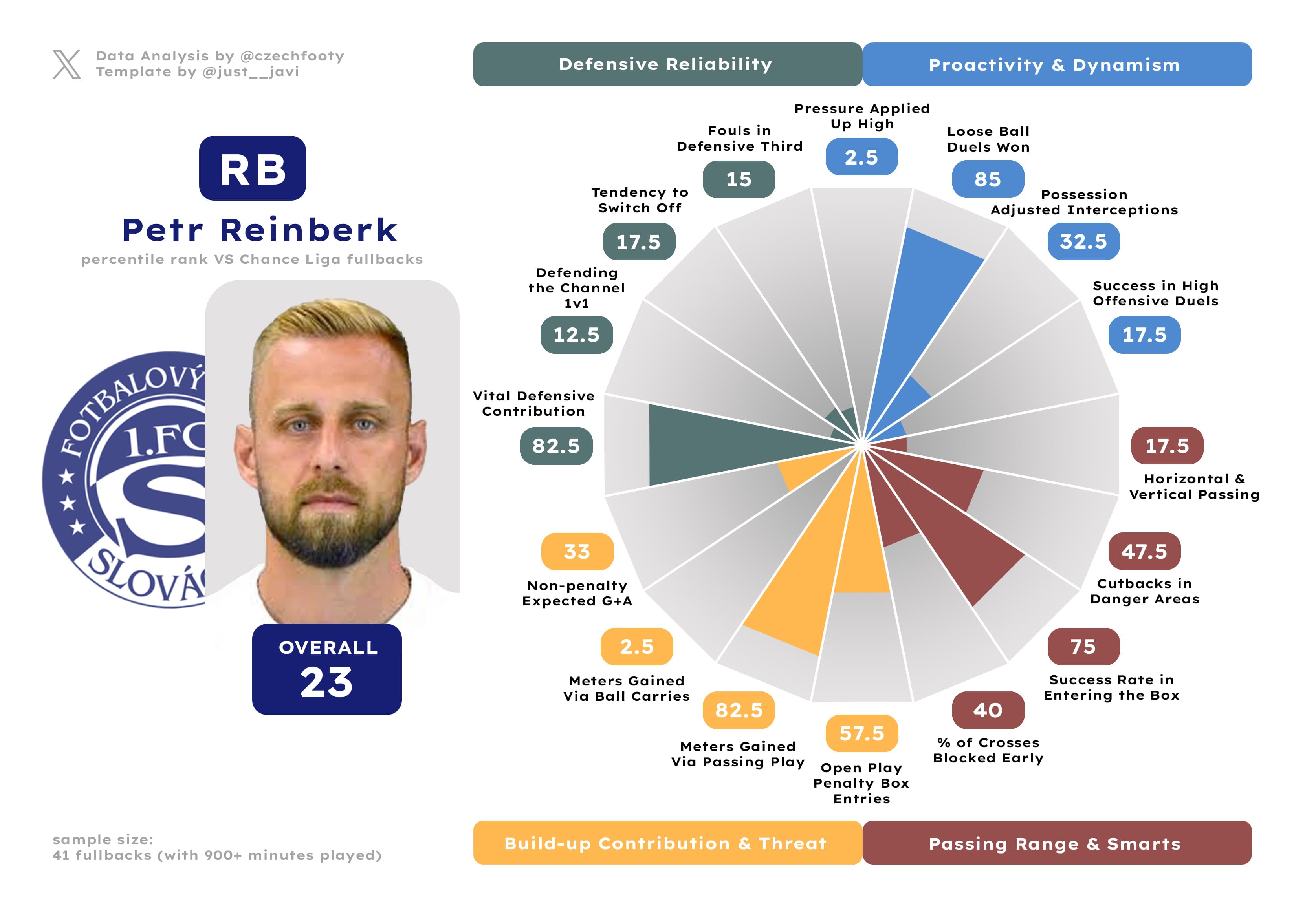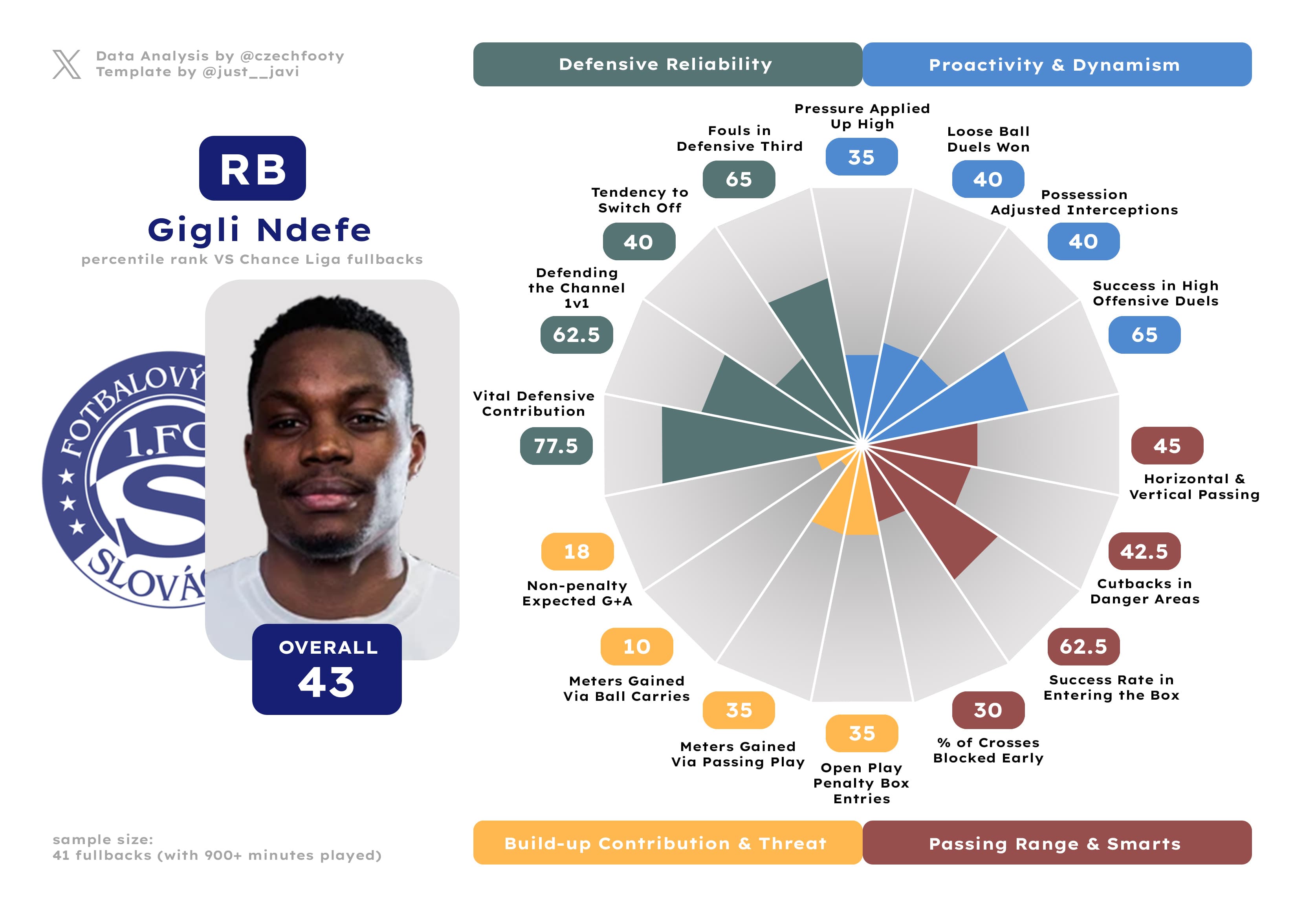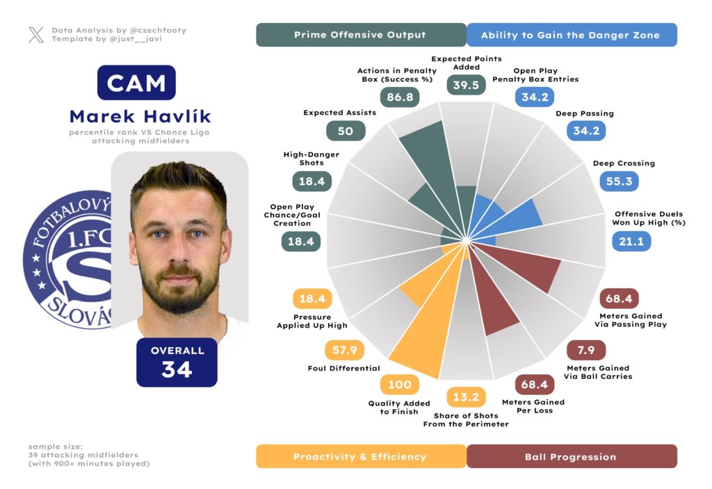 Gigli Ndefe, now firmly into the “slight decline” territory at 31, was the definition of a mediocre addition last year — which still wasn’t nearly bad enough when compared to the likes of Mišković or Azevedo. Ndefe is far removed from the player he used to be at Karviná, basically doing fuck all up front (no fullback, not even Tomáš Vondrášek, created less danger per 90 — 0.20), but he at least does the job reliably in the defensive third. Compared to the so-called offensive specialist Martin Koscelník (who joined Breda the same summer Janošek did, only to come out a different, much worse player), it’s still more or less fair value.