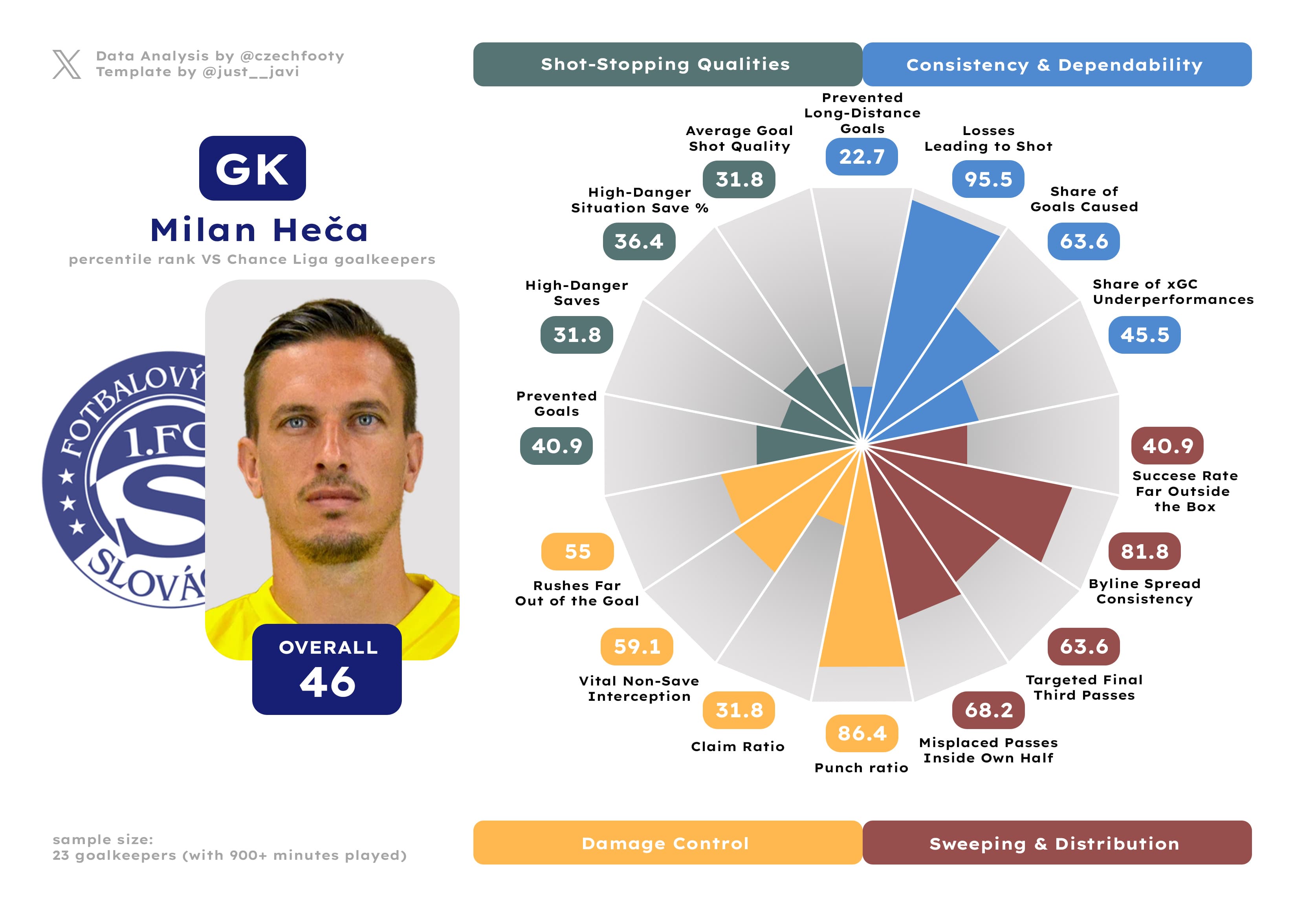 We’ll see how the situation in goal shakes out after Jiří Borek catches up following a prolonged vacation due to the U-21 Euro, but for now it’s Milan Heča back between the pipes, and it’s likely not good news for Slovácko. The club did well to commit to their younger homegrown talent amidst a sub-par run in goal, and they’d do well to re-instate him at the earliest opportunity. For someone who conceded six goals from the first 9 shots he faced, Borek recovered pretty well the rest of the way and ultimately allowed just 0.91 goals above expectations. Heča potentially makes for a top notch no. 2, but not much more these days.