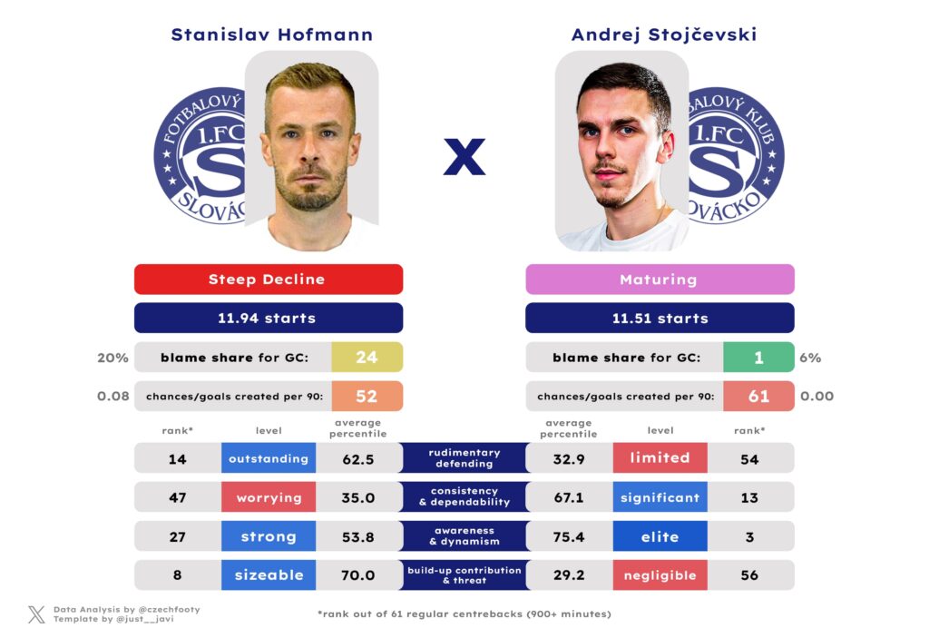 The situation wouldn’t have looked as bad coming out of the November international break. Back then, Filip Vaško was fresh off owning Plzeň and Mladá Boleslav — two UEFA participants at the time — and net positive in preventing danger (21 backstopping actions) compared to actively allowing it (13 times). He was implicated in just two goals conceded, or 16.7% of all with him on the pitch. Since then, there had been no game he concluded net positive (9 net negative ones), while he’d participated on 30% of all goals conceded with him around. He’s got one serious injury behind him, and a rough load-carrying campaign ahead of him. It was still true at the season’s end that the team was far worse without him (conceding a whopping 2.5 times per game!), but that shouldn’t be a signal to lean more heavily on Vaško while exercising the option to buy Andrej Stojčevski; instead, it should mean bringing an extra warm body to truly offset the losses of Hofmann and breakout star Ondřej Kukučka.