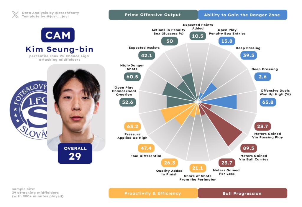 Last summer, buoyed by his spirited finish to 23/24, I also pegged Kim Seung-bin as a starting RCM… only for him to have to wait until R9 for his first proper start — cut short in the 23rd minute. His first point arrived a whole 8 rounds later, with him not contributing to a single goal beyond R21. It wasn’t just about goals, either; Kim was only a primary chance creator 0.67 times per game, shining brightly(ish) in exactly four games of the campaign — two of them against České Budějovice. It was yet another story of endless inefficiency.
