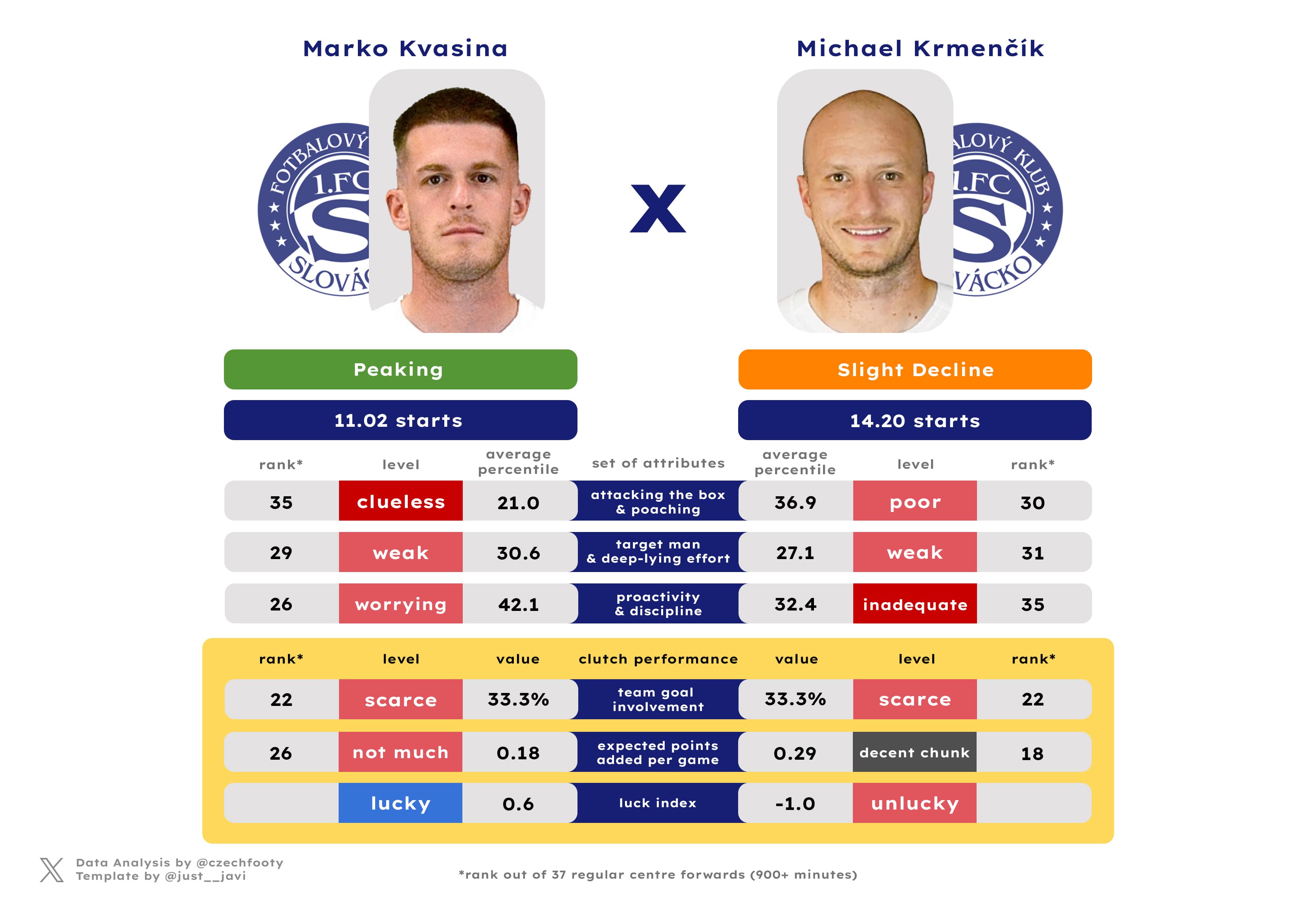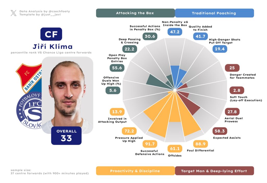 Klíma, meanwhile, wasn’t anything special but certainly didn’t appear clueless in so many areas. He isn’t a passenger in build-up, and makes for a much more proactive and disciplined presence off the ball. Where Krmenčík and Kvasina ranked 26th and 35th respectively with their average percentiles for that particular grouping of metrics, Klíma was a Top 6 striker.