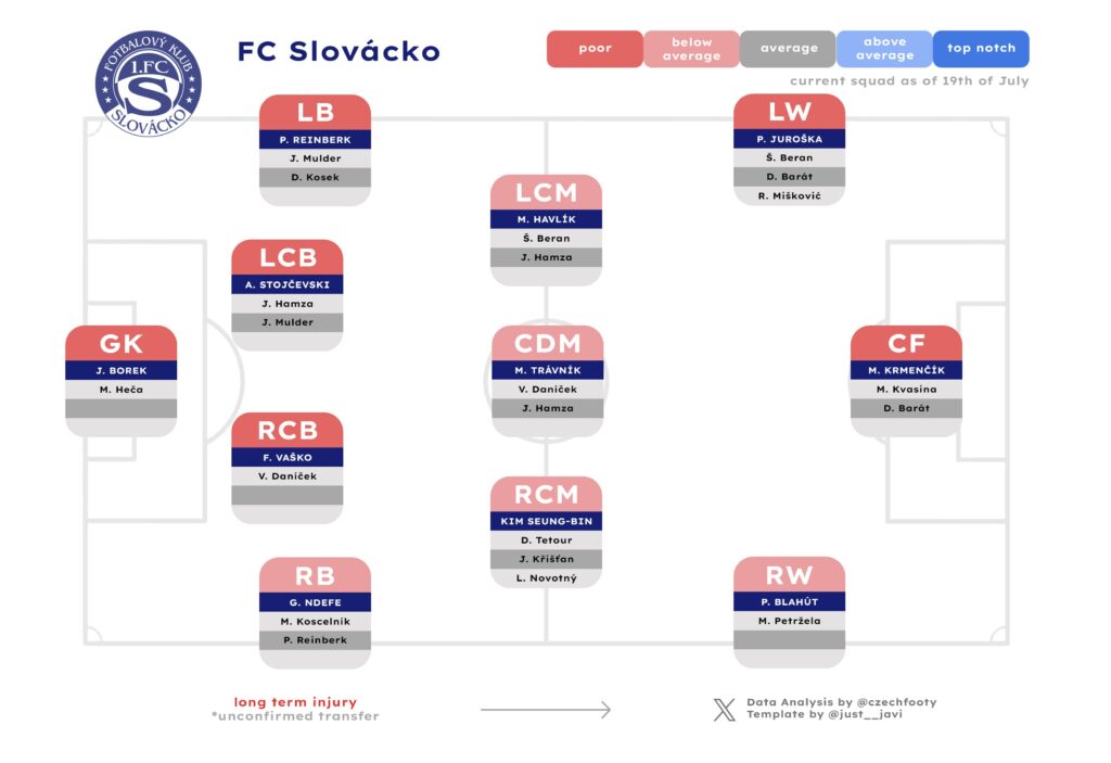 That you’re spending much of the summer patiently waiting for a 38-year-old homegrown talent is never a good sign, but it’s even worse when you’re beaten to his eventual signature by second-tier Viktoria Žižkov he’s got no emotional ties to. Nevertheless, without Ondřej Kúdela and with Daníček back to patrolling the midfield, there’s a gaping hole at centre back.