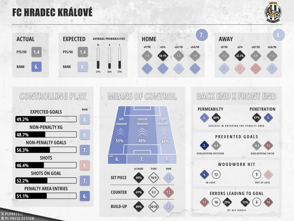 A lot of what (else) went wrong for ‘Votroci’ had an element of “weird” or “unusual” to it, too. Goalkeepers facing them collectively allowed 0.54 goals above expectations, which doesn’t sound like a handicap until you realize that only three teams enjoyed less of luck and the team just above Hradec already benefitted from 2.37 goals allowed above expectations — a truly wild jump from 13th to 12th. One peculiar, albeit insignificant contributor to this: all three penalties, all taken by a different player (Vlkanova, Mihálik, even Petr bloody Kodeš), saved by the goalkeeper. This sort of a 100% failure rate has only been posted by one other club (Jablonec of 19/20; also 0-for-3) in recent memory, and only RH Brno of 57/58 went one further in the entire post-war history. If the next penalty follows suit, it’ll set a club record.