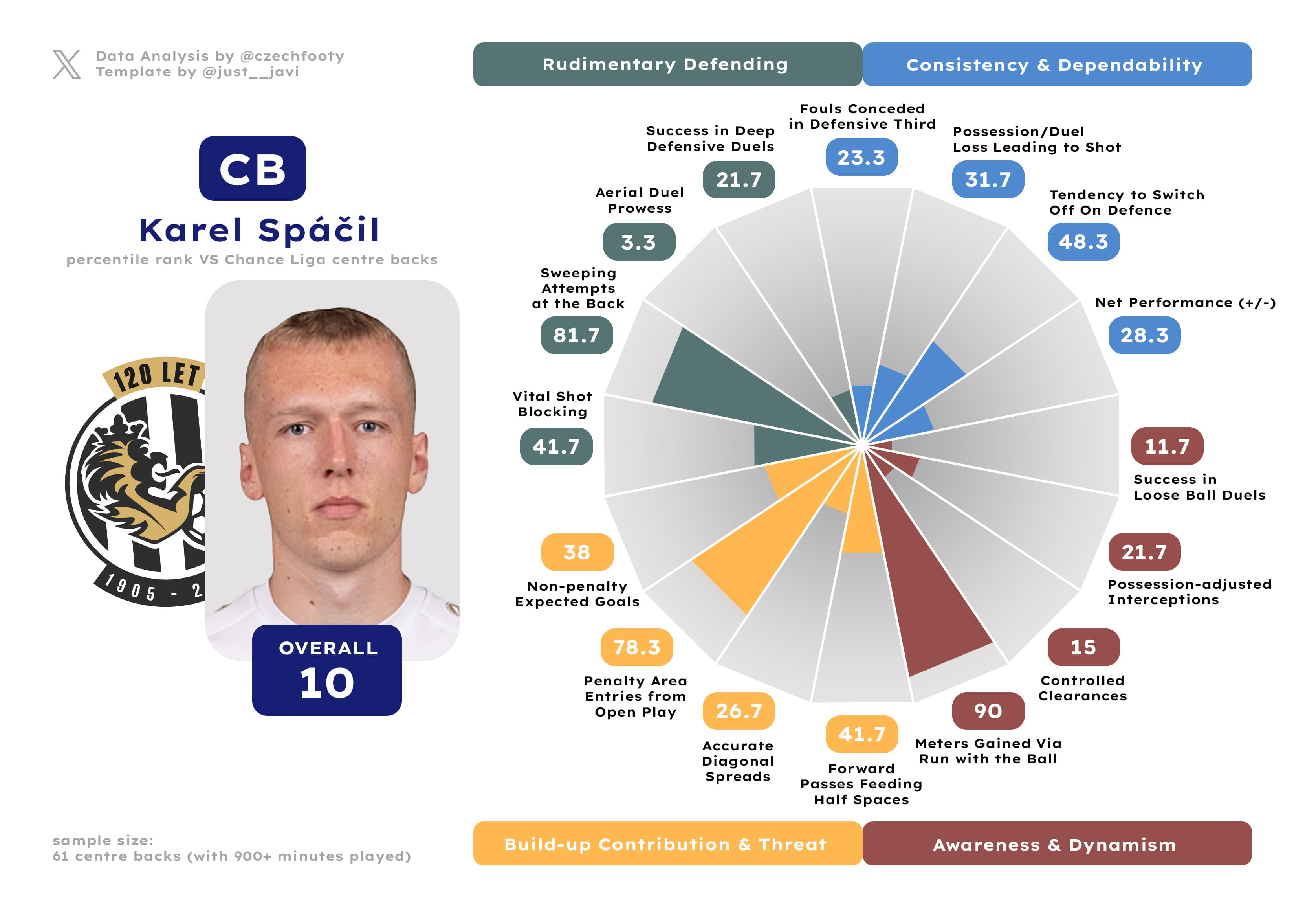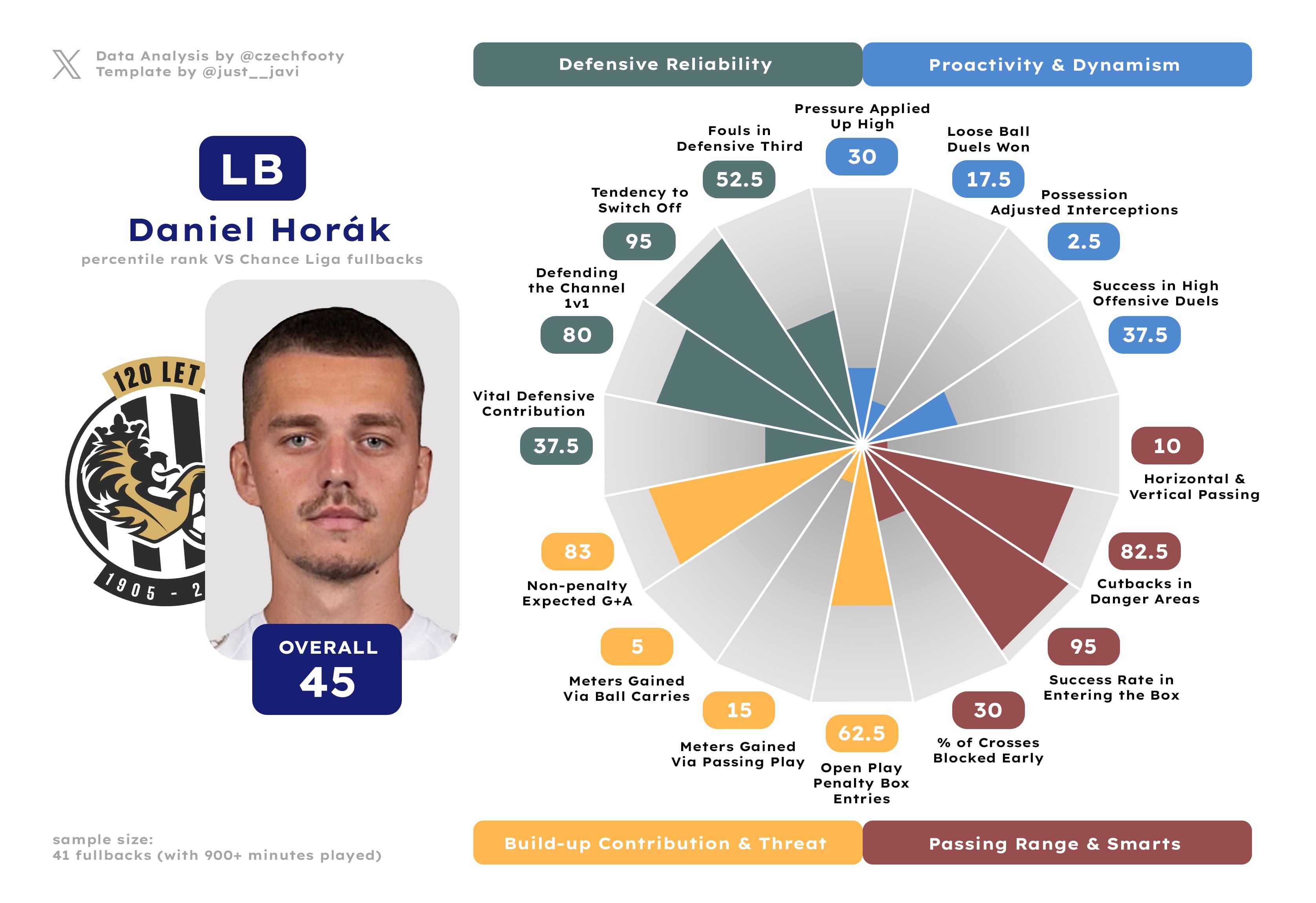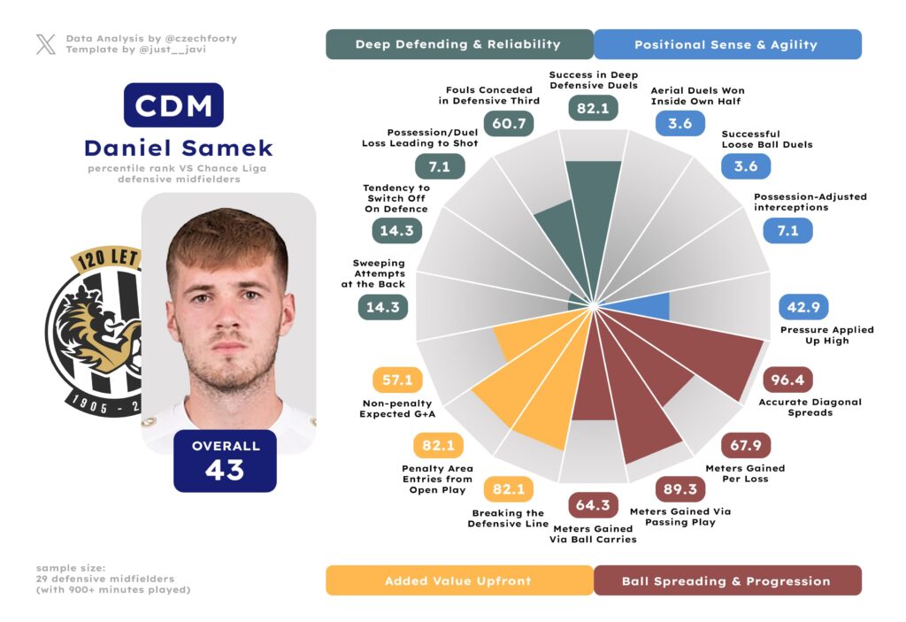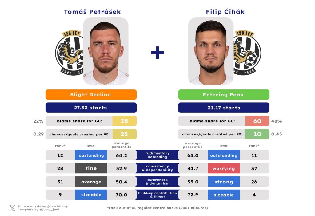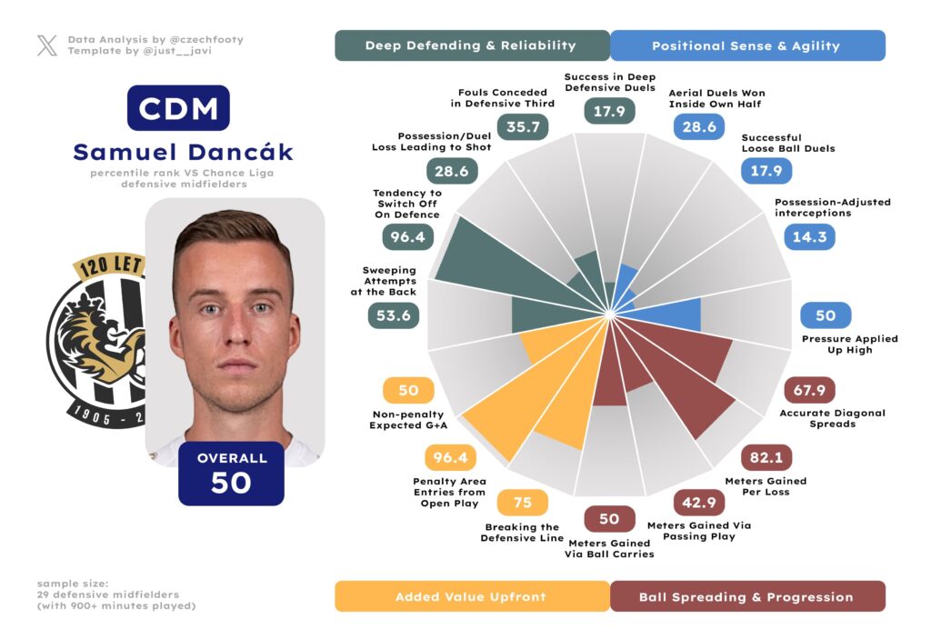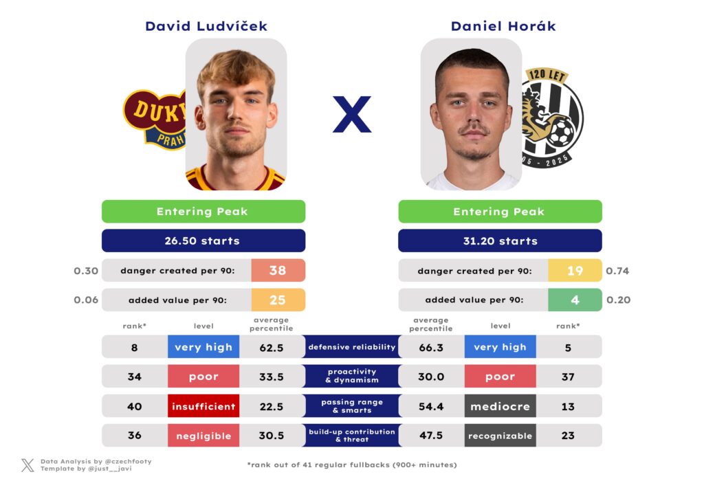 Anytime they mention Hradec not creating shit in possession, I think of him. Samuel Dancák deserves more respect of y’all, even as he exchanged “strong” positional sense & agility for “inadequate” courtesy of some wild drops in aerial and loose ball duel success rate (both down by roughly 15%) or possession-adjusted interceptions. I can’t explain this, but what remains — crucially — is a decent ball progressor and an absolute cheat code in gaining the attacking penalty area from open play. Only Kalvach was more prolific at this discipline.