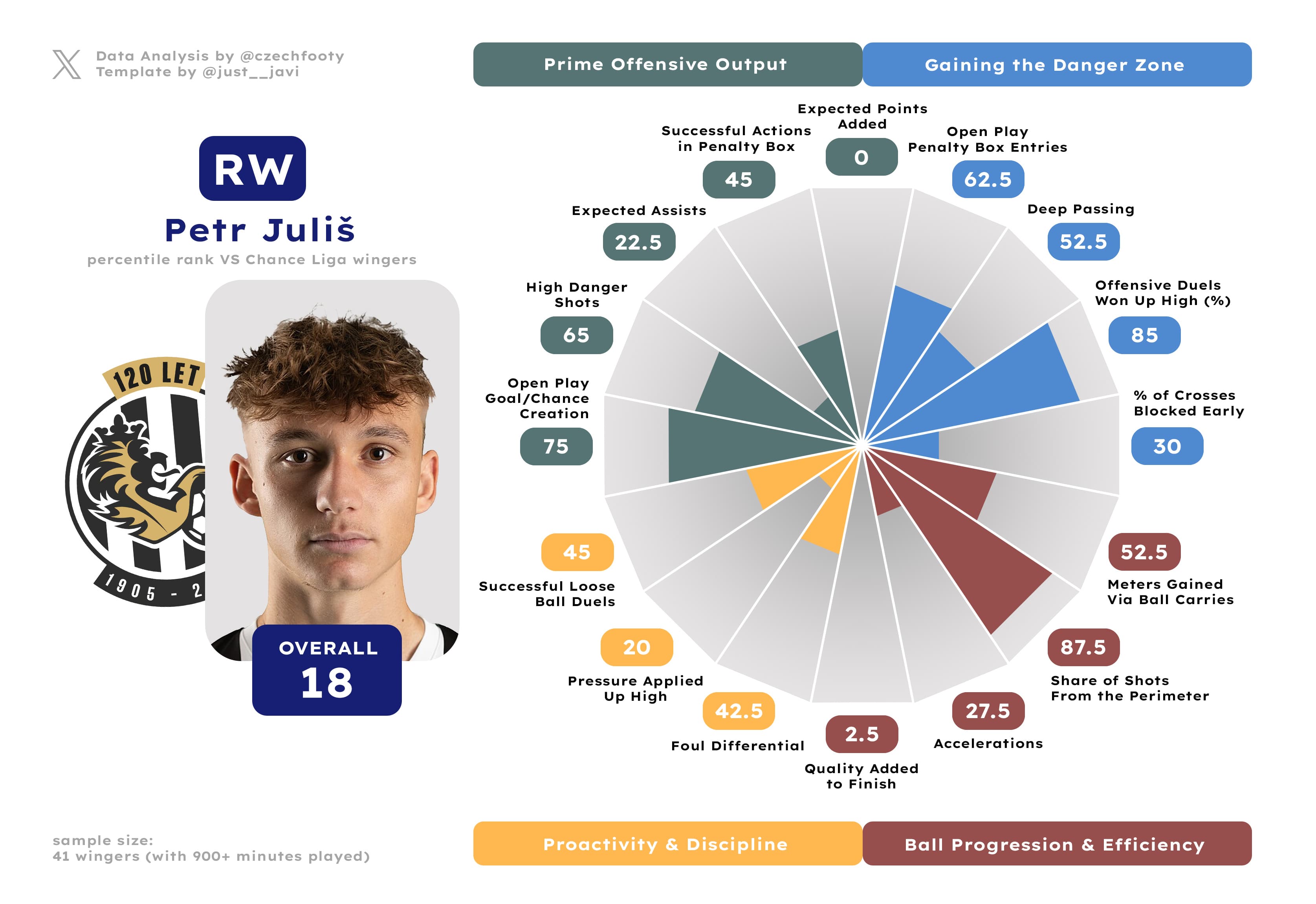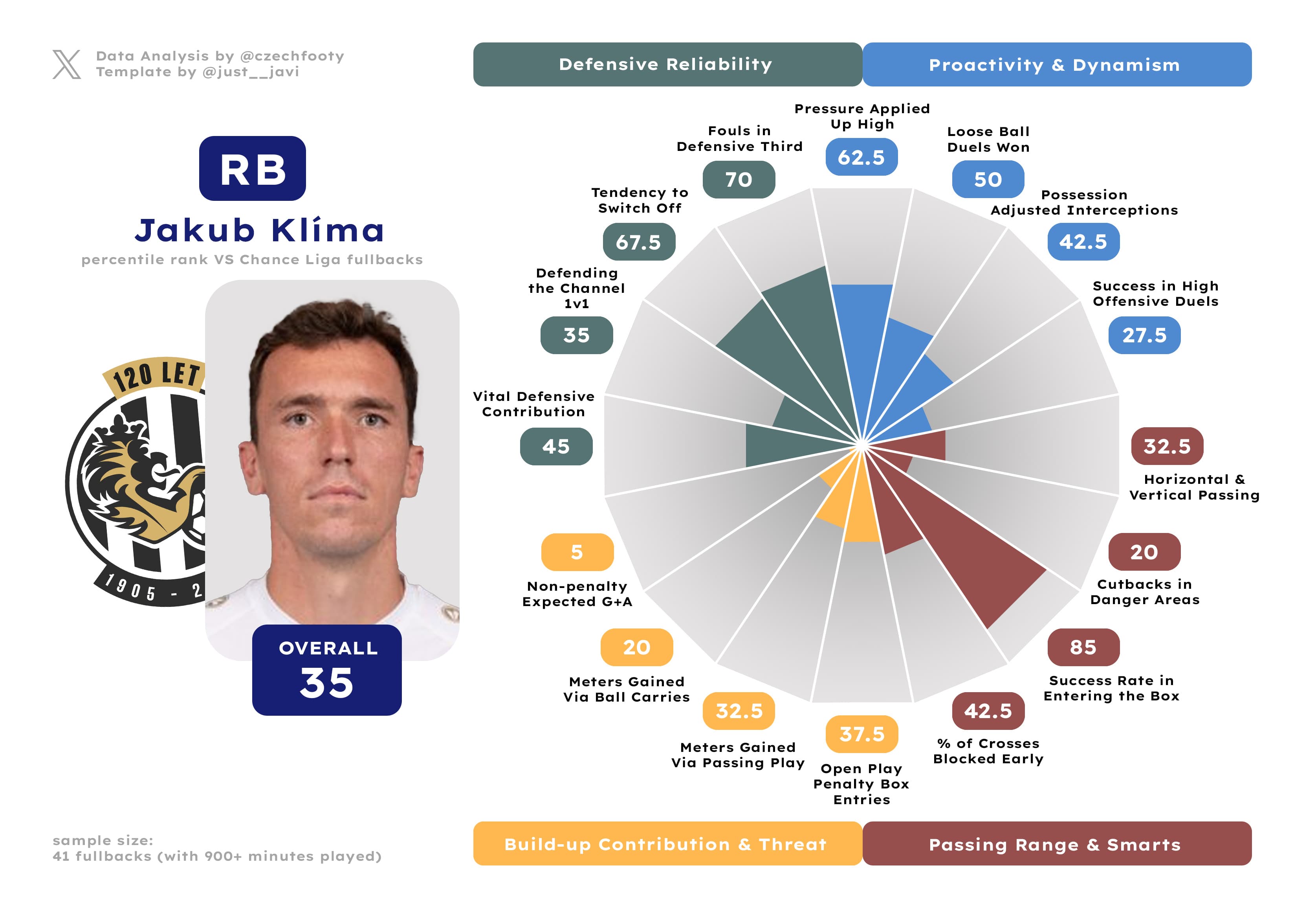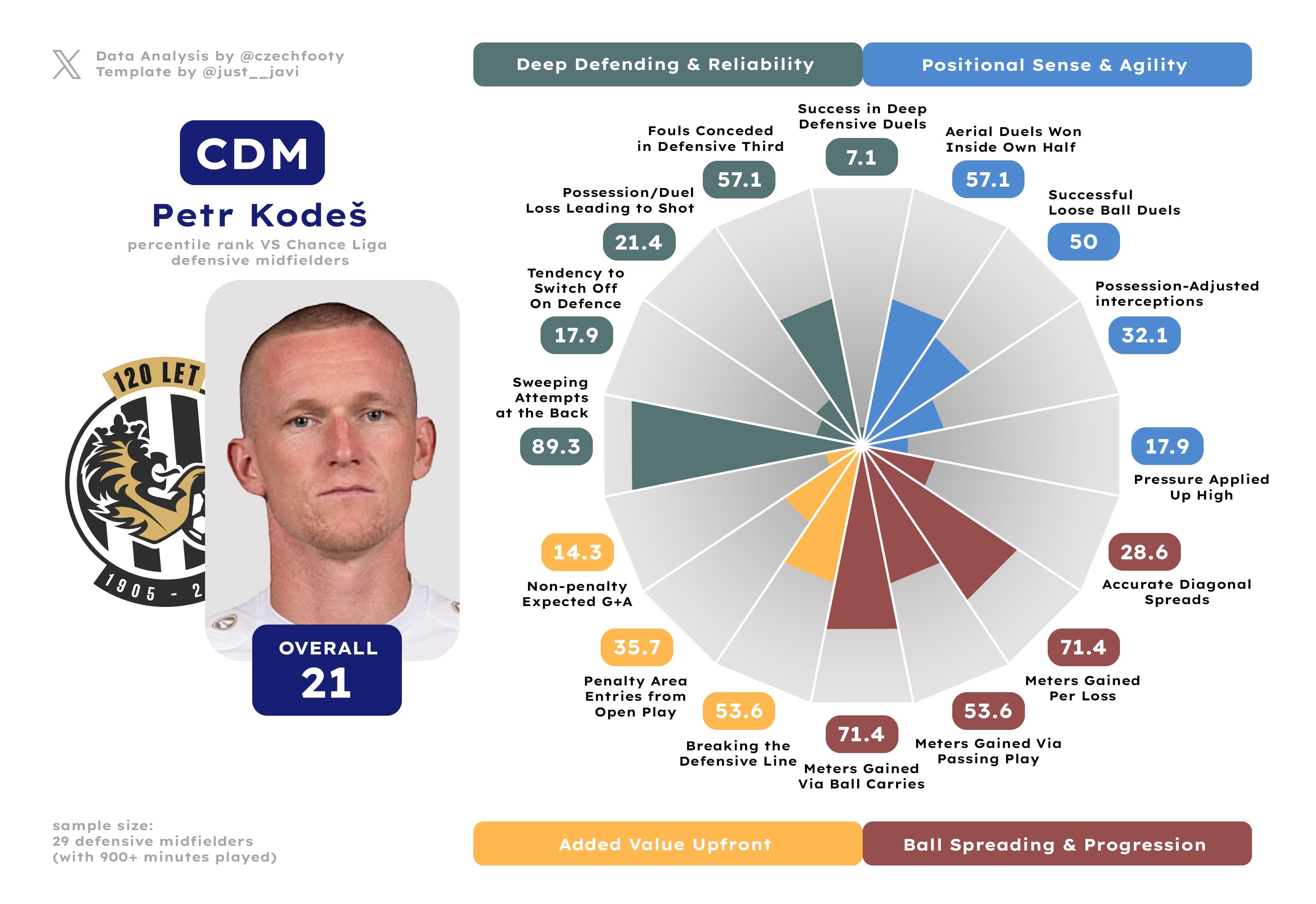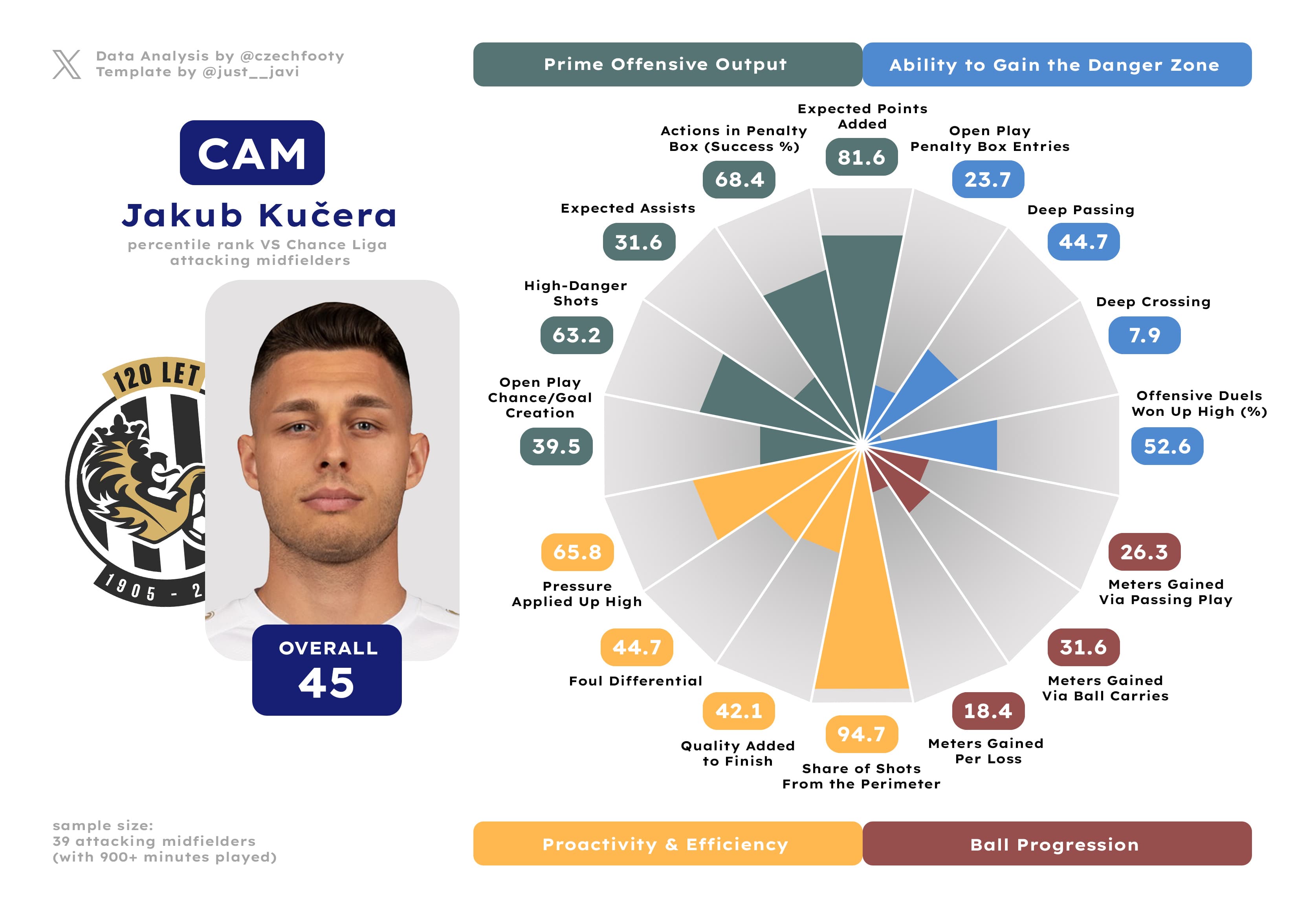 Anytime they mention Hradec not creating shit in possession, I think of him. Samuel Dancák deserves more respect of y’all, even as he exchanged “strong” positional sense & agility for “inadequate” courtesy of some wild drops in aerial and loose ball duel success rate (both down by roughly 15%) or possession-adjusted interceptions. I can’t explain this, but what remains — crucially — is a decent ball progressor and an absolute cheat code in gaining the attacking penalty area from open play. Only Kalvach was more prolific at this discipline.