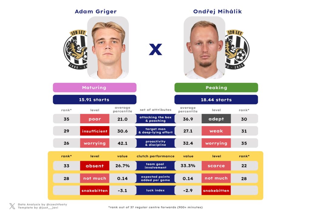 While it’s very plausible both these veterans are romanticized by many, it’s also easy to see the appeal. Van Buren has always been a committed hard worker who makes his presence felt, something that was also apparent on his Ekstraklasa stint. Adam Griger, who he’s coming to rival for playing time first and foremost, was often completely lost and couldn’t bring himself to create anything for teammates. If nothing else, Van Buren should be more capable (Griger) and more consistent (Ondřej Mihálik) in connecting with the likes of Vlkanova, Václav Pilař or (if it comes to it) Slončík. He led all centre forwards in expected assists and deep completed passes/crosses only a year ago (?!?!); two metrics Griger was third-worst and the absolute worst in the league this season. Compared to Mihálik, MvB has got a track record that makes him likely to be more proactive in forcing turnovers up high and more of a presence in the box. MvB has always had a knack for putting himself as well as others in a position to score. It might be different at 33 (in August), but probably not that different.