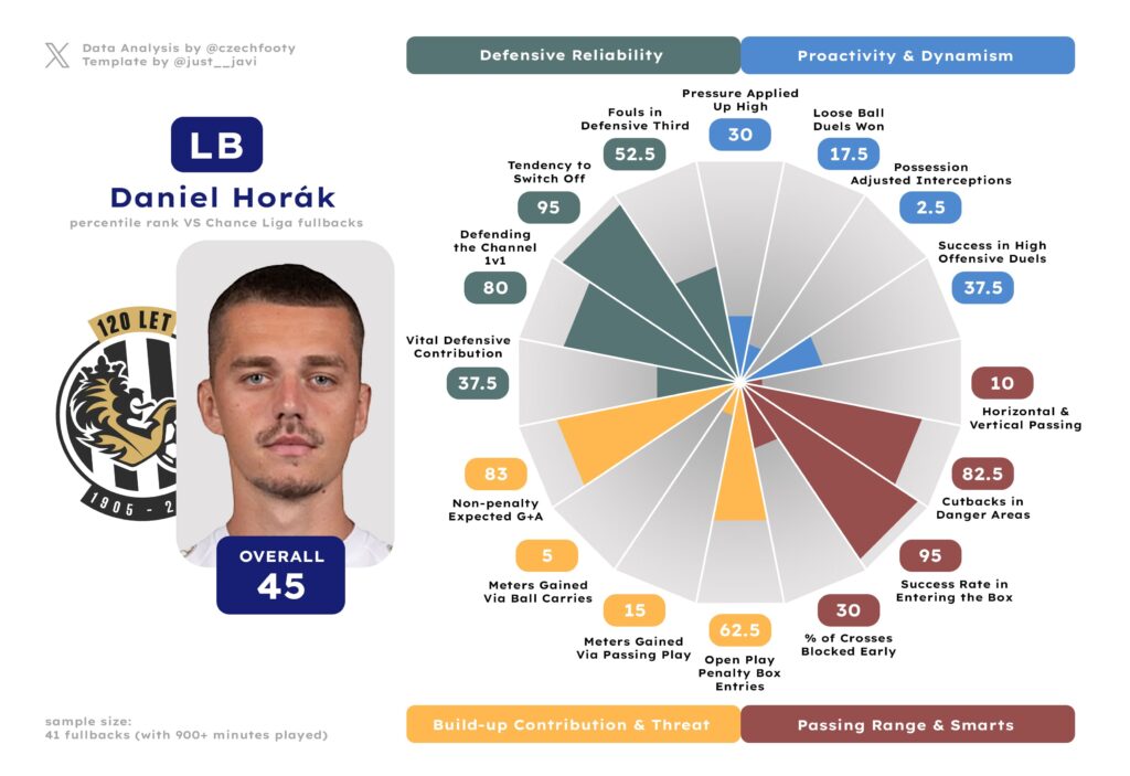 Now, is it necessarily a problem that Horák clearly isn’t a dynamic force or a particularly consequential passer? No, and no. Some things are, after all, by design — like the relative lack of high pressures, no doubt owing to Horejš’s passive setup. Other things are simply more important for Hradec: high-percentile 1-on-1 defending, the third-best success rate in entering the box from open play, his smart (if not progressive) passing, especially cutbacks.