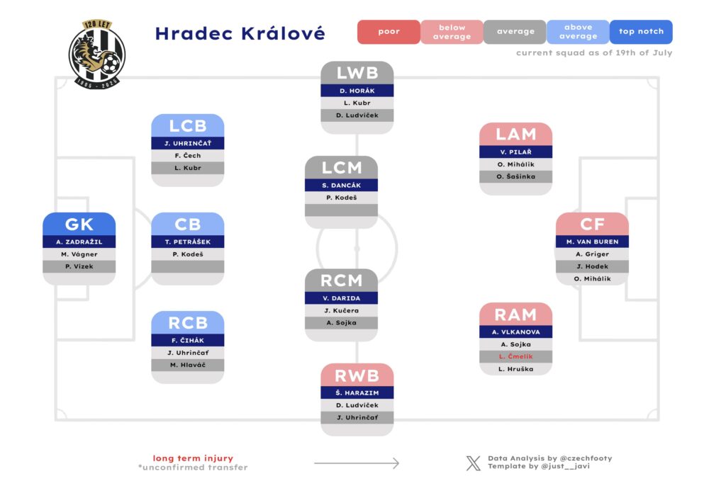 This isn’t to say Hradec lack alternatives that could make the Slončík loss more palatable, but that hinges on a couple of wild cards: A) Sojka operating at a high level in an advanced role he’d rarely filled for Koubek at Plzeň; B) Pilař staying healthy for a majority of the season; C) Mihálik hitting his stride deeper down the pitch with a more convincing reference point above him in Van Buren. Which one do you trust the most? Pilař still has got some serious game, but he reminds me a bit of Milan Petržela who had also sustained it for long long time until he suddenly fell off the cliff. Turning 37 in October, Pilař is very much in that territory.