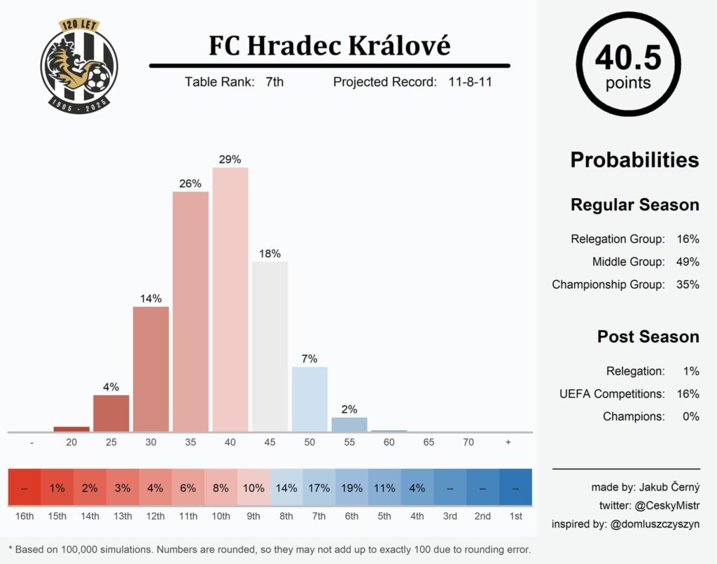 Returning to my earlier suggestion Hradec Králové are, in fact, not stagnating under David Horejš: they have improved in point-per-game gain on both counts, going from 1.32 points in 22/23 to 1.44 in 24/25. No major progress, I agree, but one wonders how much higher the club’s ceiling realistically lies. From the forecast point of view, Hradec did hit something of a roadblock, not reaching the regular season target for the first time, but it’s worth pointing out the said target (43.7) would also mean their highest modern-day total by a mile (41 from 10/11 leads the way). Currently, I think that’s got to be the goal: Hradec should aim to set the record as far as relatable seasons go (their title-winning campaign of 59/60 would’ve seen them net 54 points if there were 30 rounds instead of 26, and if the wins were already three-pointers then), which they manage to do in roughly every other simulation. Decent odds.
