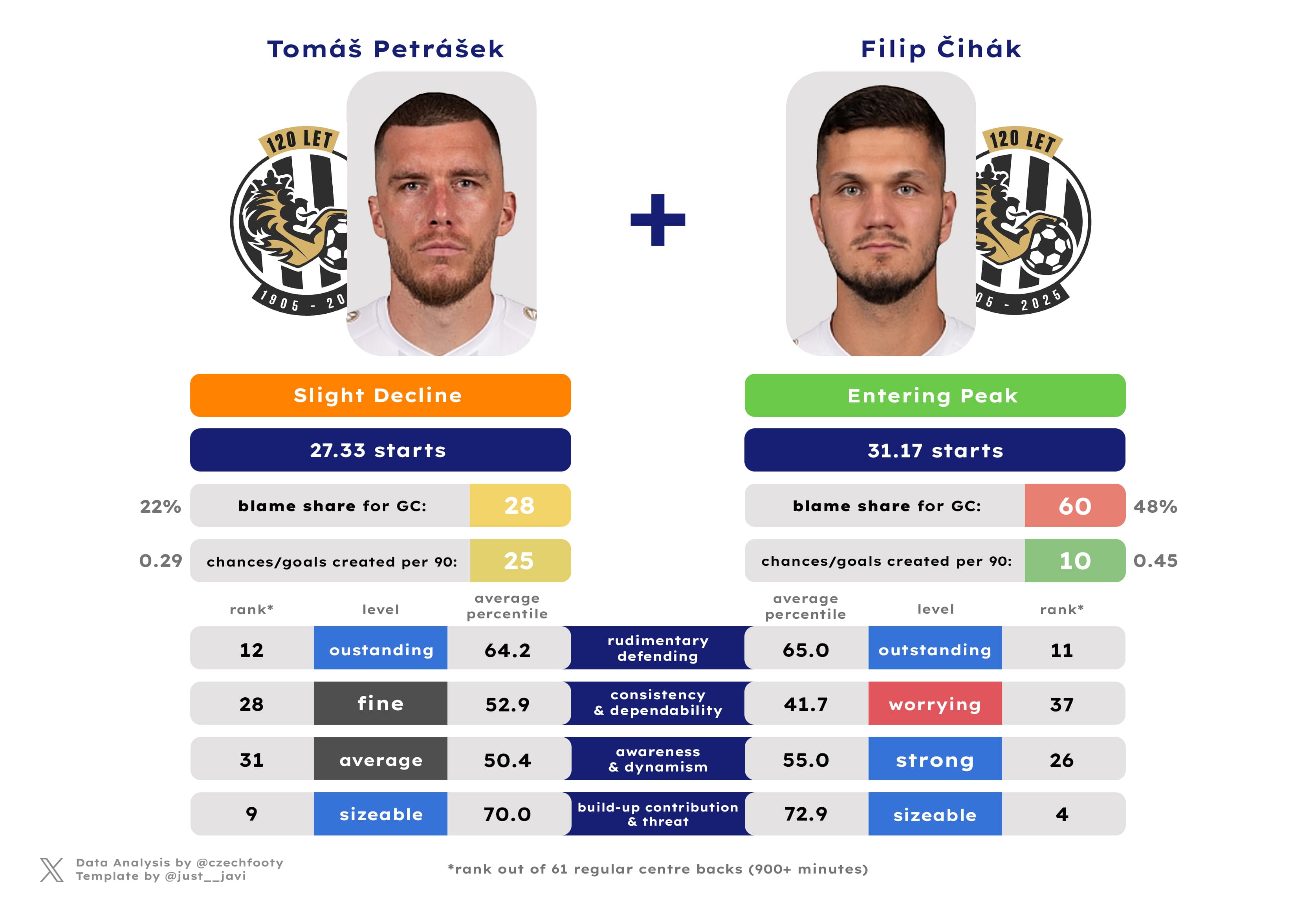 Ultimately, his shot-stopping ranked best overall, with an average percentile of 88.2 — seven points clear of his closest rival. He was Top 10 in all four aspects of goalkeeping; only three other custodians could say the same over the past two seasons. One is Holec, the other two are Kinský (twice) and Letáček. Can Zadražil nab that sweet Top 4 deal for himself, too?