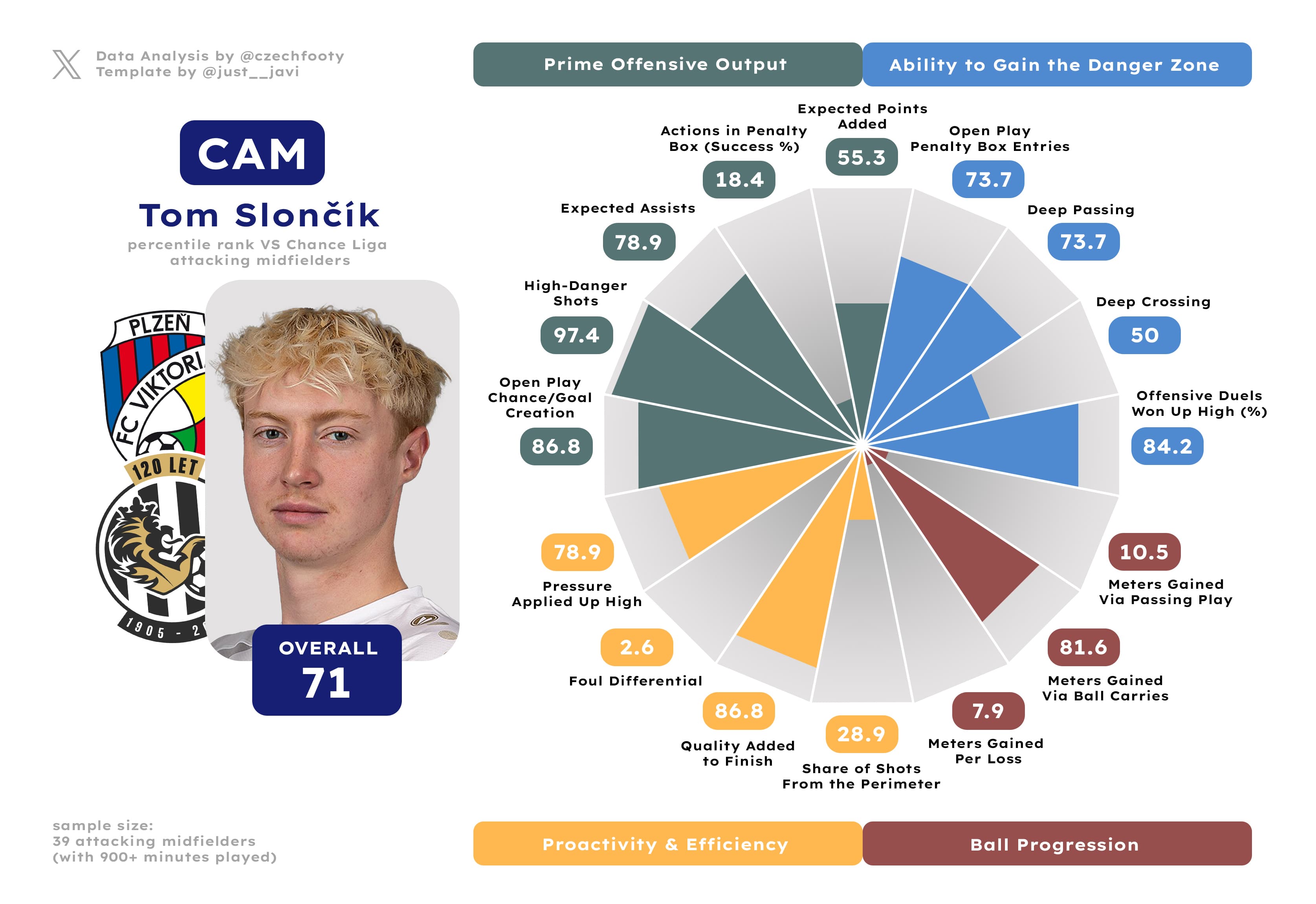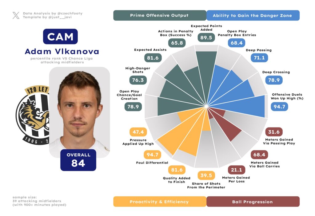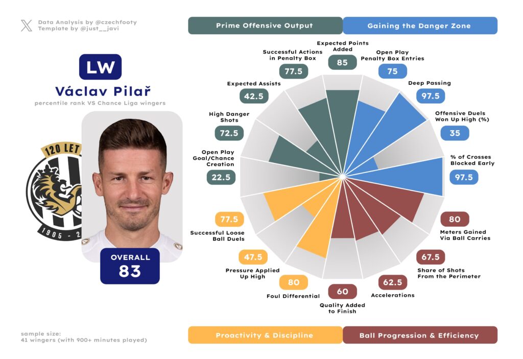 As long as he’s fighting for his place at Plzeň, Tom Slončík will be dearly missed for one simple reason: he’s not a one-trick pony in keeping opponents on their toes. Slončík landed in at least 73th percentile for his ability to enter the penalty area in control, create goalscoring opportunities for teammates both per my notes and per Wyscout’s xA, and shoot from 0.15+ xG positions himself (though five of his 11 high-danger shots were still for Viktoria’s benefit). He’s one sweet finisher, a dribbler with a progressive edge, and a surprisingly effective disruptor in applying pressure up high, which basically makes him a complete package as far as the final third is concerned. Make no mistake, he’s 100% a passenger anywhere else on the pitch; but if this is the niche you are buying hoping to bring back on loan, it’s possibly the most valuable niche in football — worth every single penny.