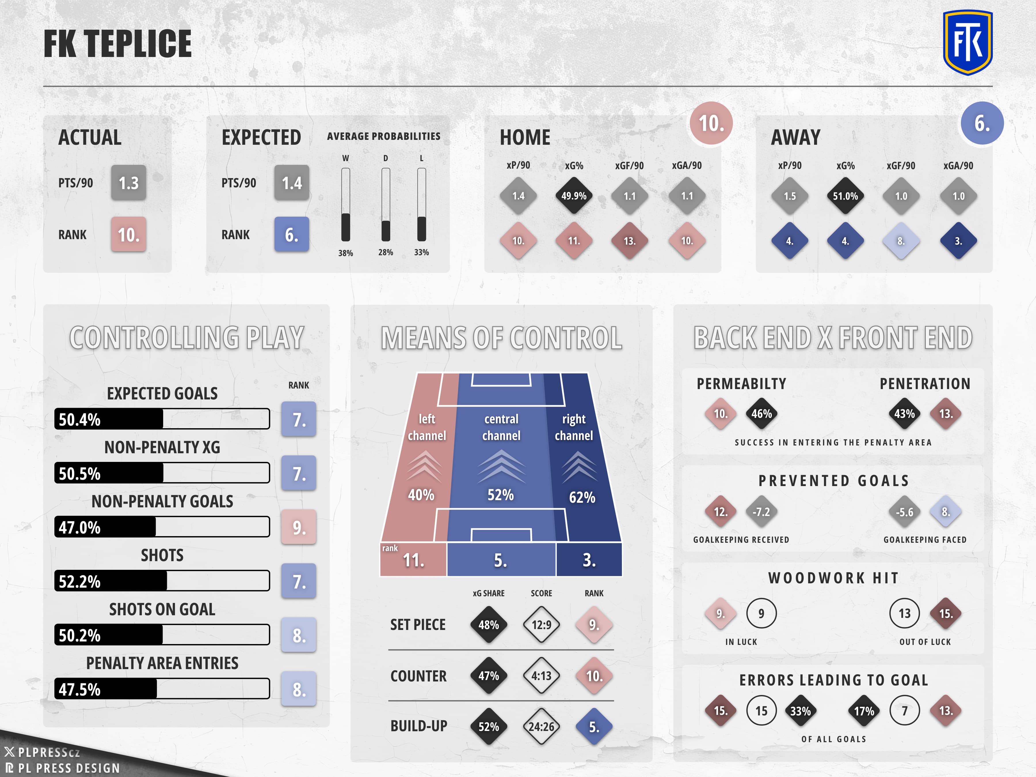Well, that… but also this: since the marvelous xP rate away from home didn’t nearly keep up with their actual point gain (15 points from 17 away games instead of twenty-five), Teplice constantly needed to make up a whole lot of ground at Stínadla and decidedly kept failing to do so. Their point pace wasn’t too bad (8th), but the underlying numbers were; fourth least threatening offence per xGF, seventh worst defence per xGAExpected Goals Against (xGA) estimates how many goals a team should have conceded based on shot quality, location, and context.. Accounting for their own backyard, only two teams completed less passes and crosses in/around the attacking box.