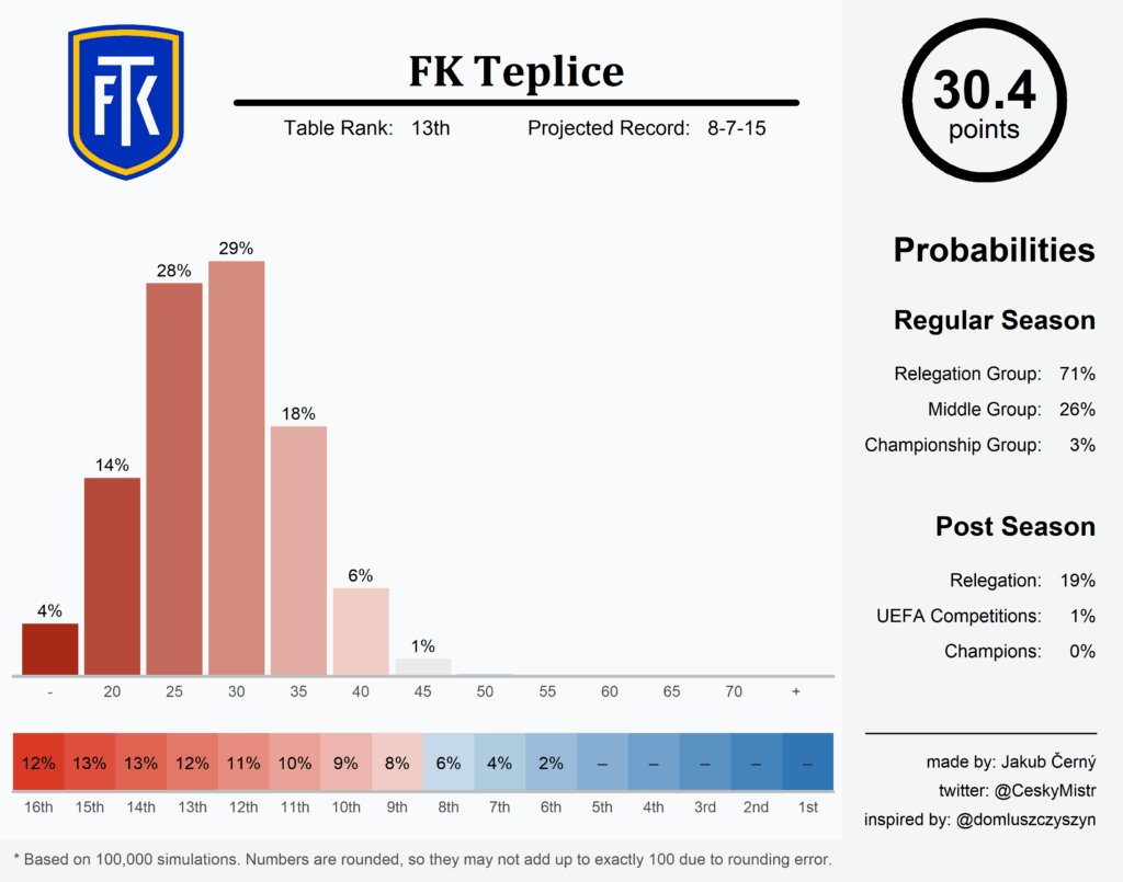 Despite outworking its original regular-season point projection for the third year on the trot (all put together, the model has already been wrong about Teplice by a staggering 19.6 points!), you can actually see a more pessimistic forecast above than a year ago. To be fair, the simulations were run at a time when it wasn’t clear what’s going to happen with Halinský, but even just losing Yasser, Gning, Mićević, Langhamer or Labík without replacing them solidly would’ve been enough to secure nothing more than stagnation. That said, it’s not all doom and gloom for Teplice; they were this model’s overwhelming favourites for direct relegation in 2022 (68%), whereas now there are three bigger suspects. They only have a 26% chance of landing where Frťala wants them to land (in the middle); with the exact same likelihood attached to not avoiding the relegation play-off. So, more of the same for ‘Skláři’?