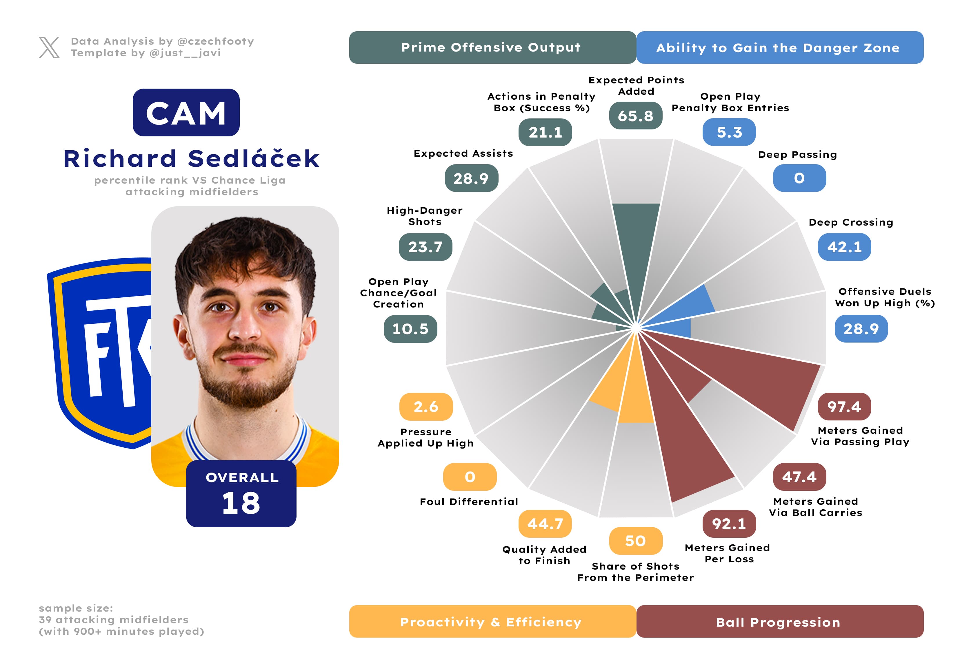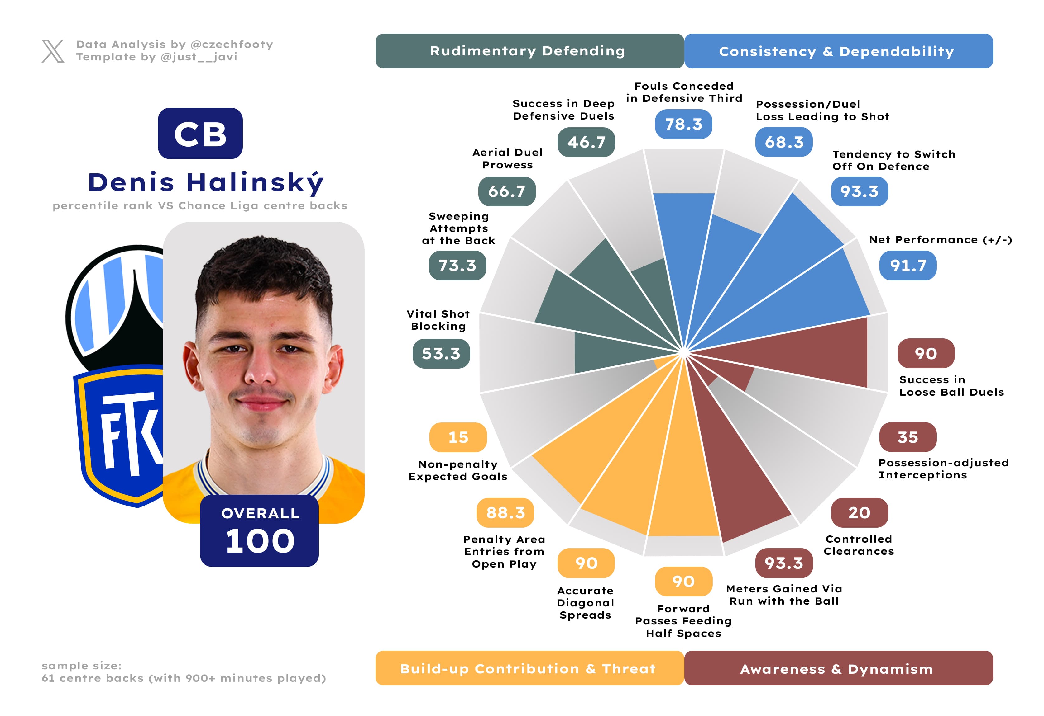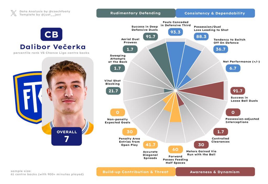 It’s always tricky to attribute a whole team’s defensive performance to one player, but in this case, it’s hard to not track this improvement back to Halinský. His alertness was always great, and so was his positioning combined with dynamism. Besides, with the Slavia loanee, it’s never just about defence; in terms of build-up contribution and threat posed, only six centre backs grade out better (four of them play on Top 3 teams, the others are Čihák and Králik).