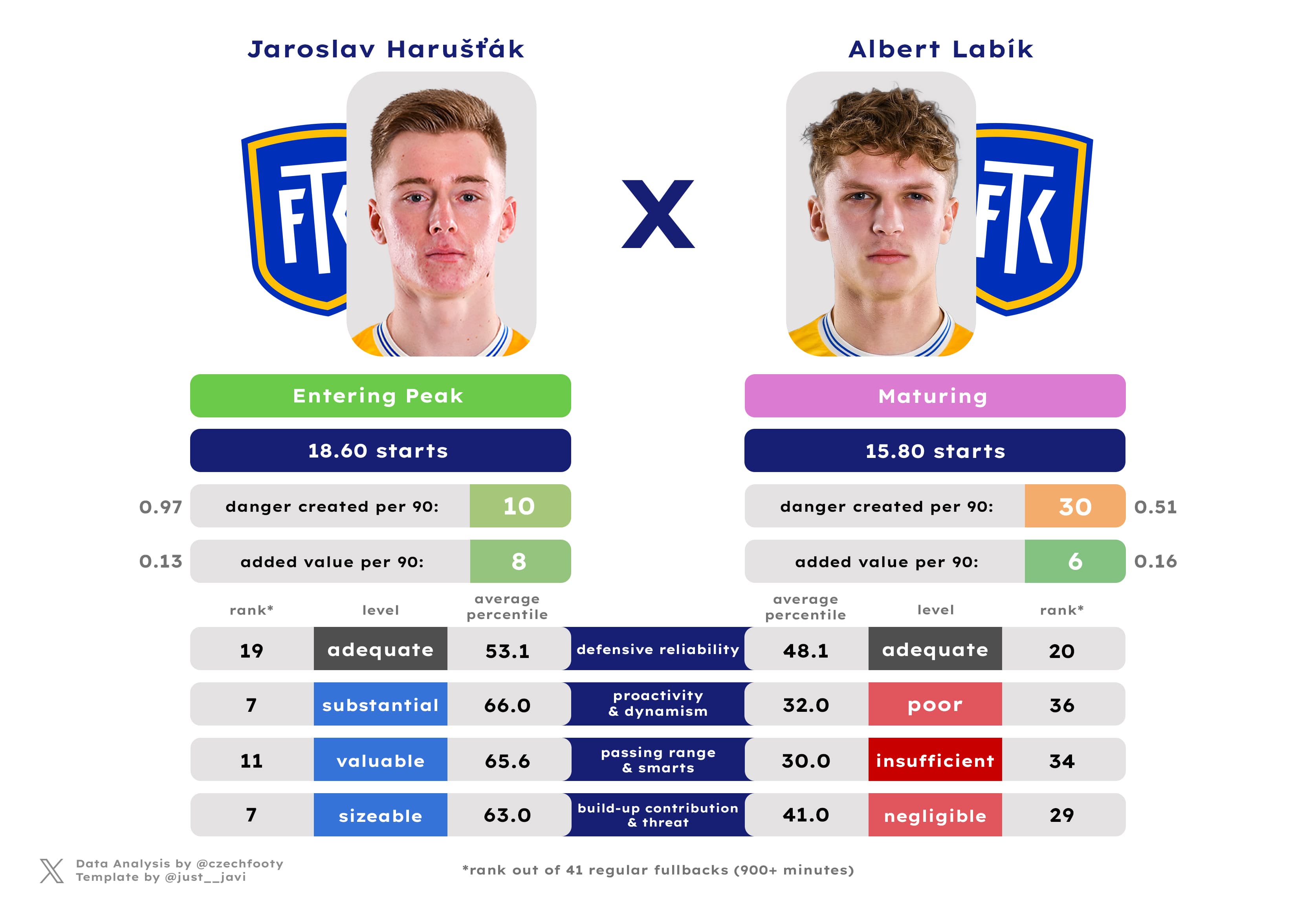 What’s worse: Harušťák wasn’t just missed dearly by Jan Suchopárek at the U-21 Euro or cautiously considered by Baník Ostrava for the activation of a buy-back clause; he was breaking out big time. For a first-year regular on a bottom-six outfit, ranking in the upper half of the fullbacks’ deck for all four sets of metrics is nothing short of amazing. Harušťák is in a company of two Slavia fullbacks, two Sparta ones, and Polidar. This now means more of Krejčí on left-footed set piece duty, and definitely less penalty area cracking done from open play. Harušťák ranked 7th league-wide in this particular metric, ahead of Sláma or Fleišman.