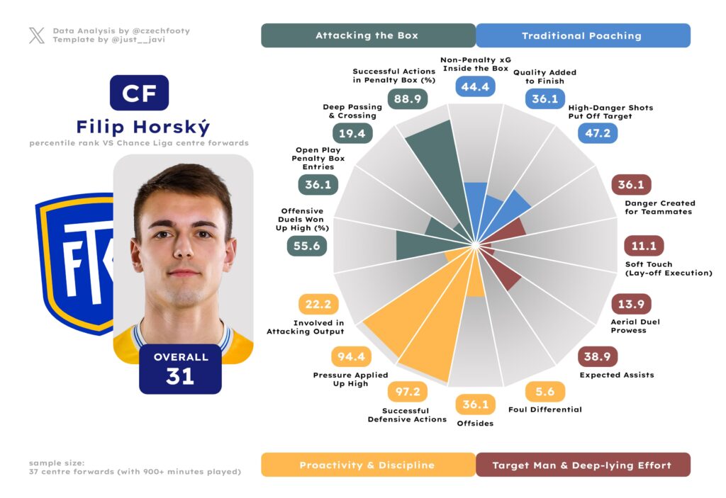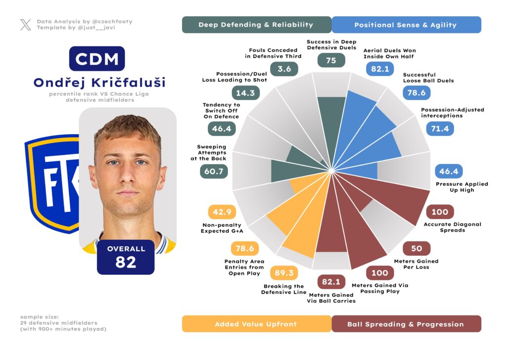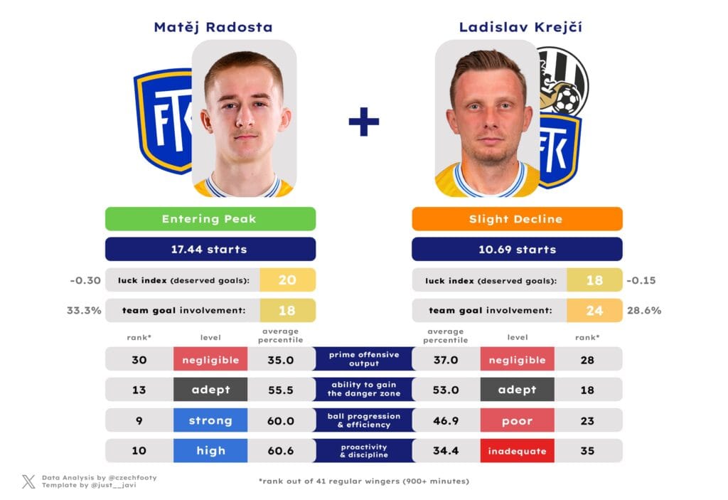 In the case of Daniel Trubač, conversely, Sigma’s interest was certainly real, intense and involved multiple improved bids, but they ultimately turned their attention elsewhere. In the case of Trubač, too, it’s less about earning that transfer after all, and more about rewarding his club for standing the ground. Trubač’s contract actually expires before Kričfaluši’s (next summer), and the fact he wasn’t part of the recent flurry of extensions together with Matěj Radosta and Robert Jukl could be interpreted as a source of some concern. Much like Trubač enduring rare injury struggles in 24/25 and not quite looking like himself in entering the penalty box successfully (down from 63.4 percentile-wise) or deep passing (previously 58.5).