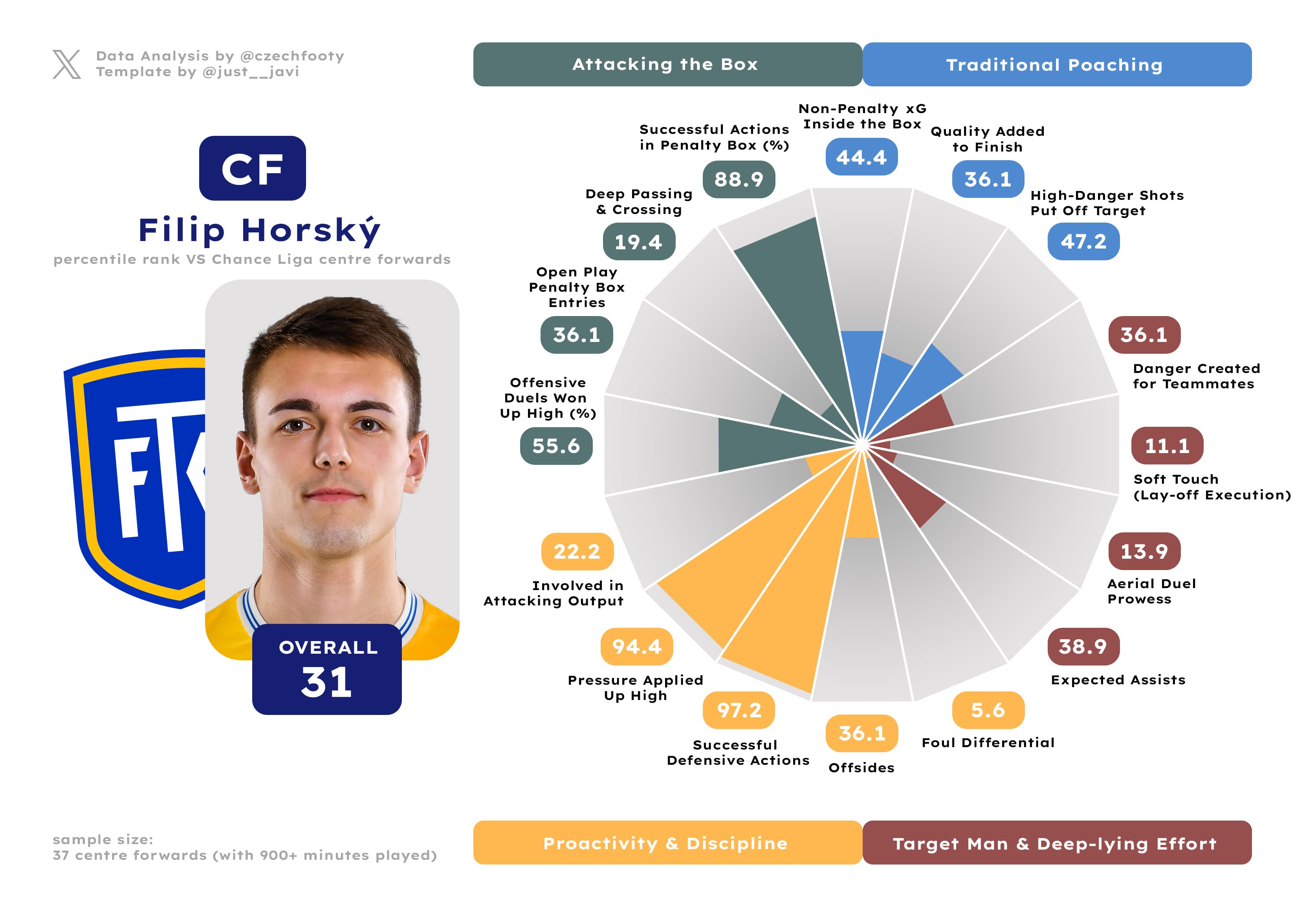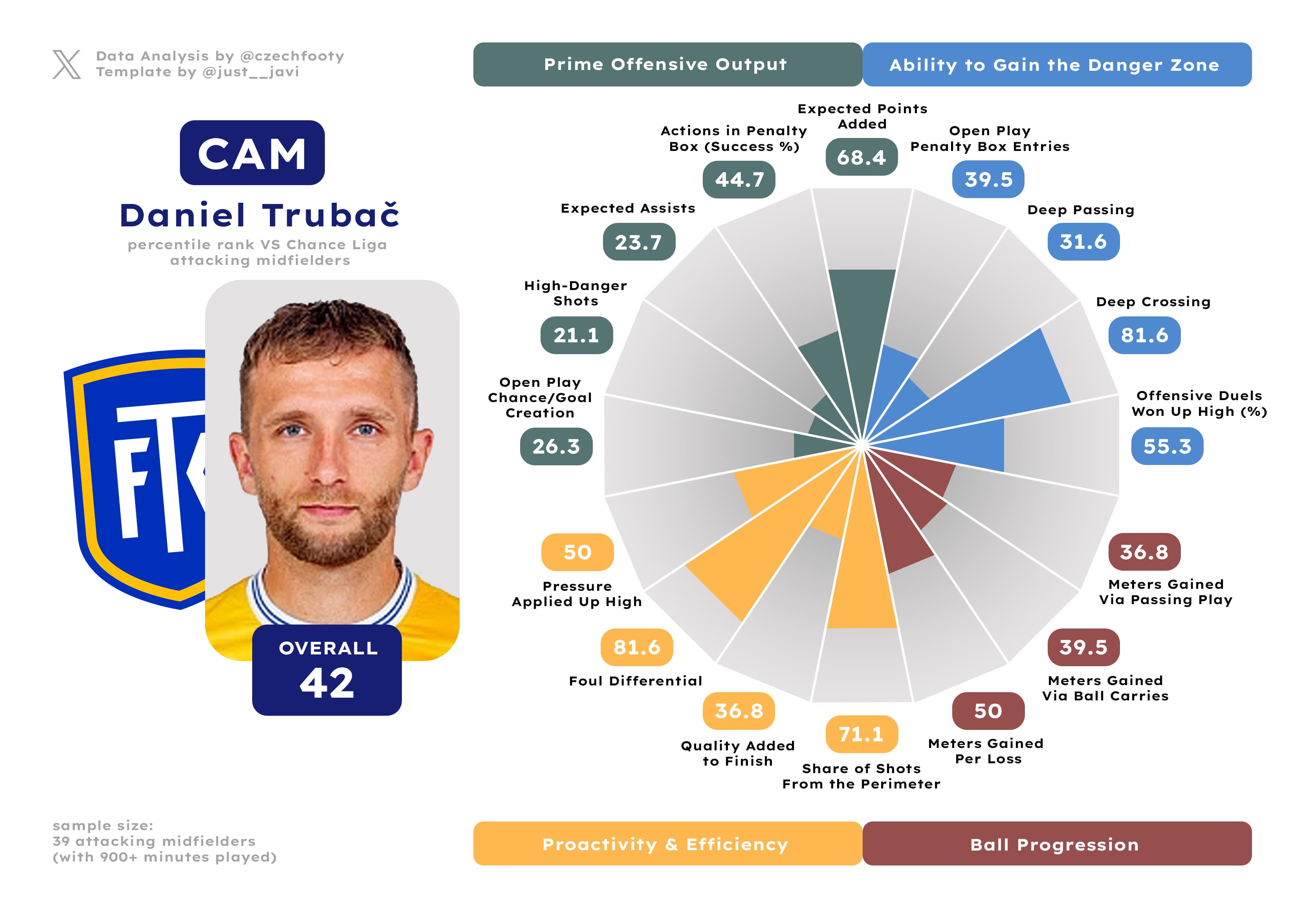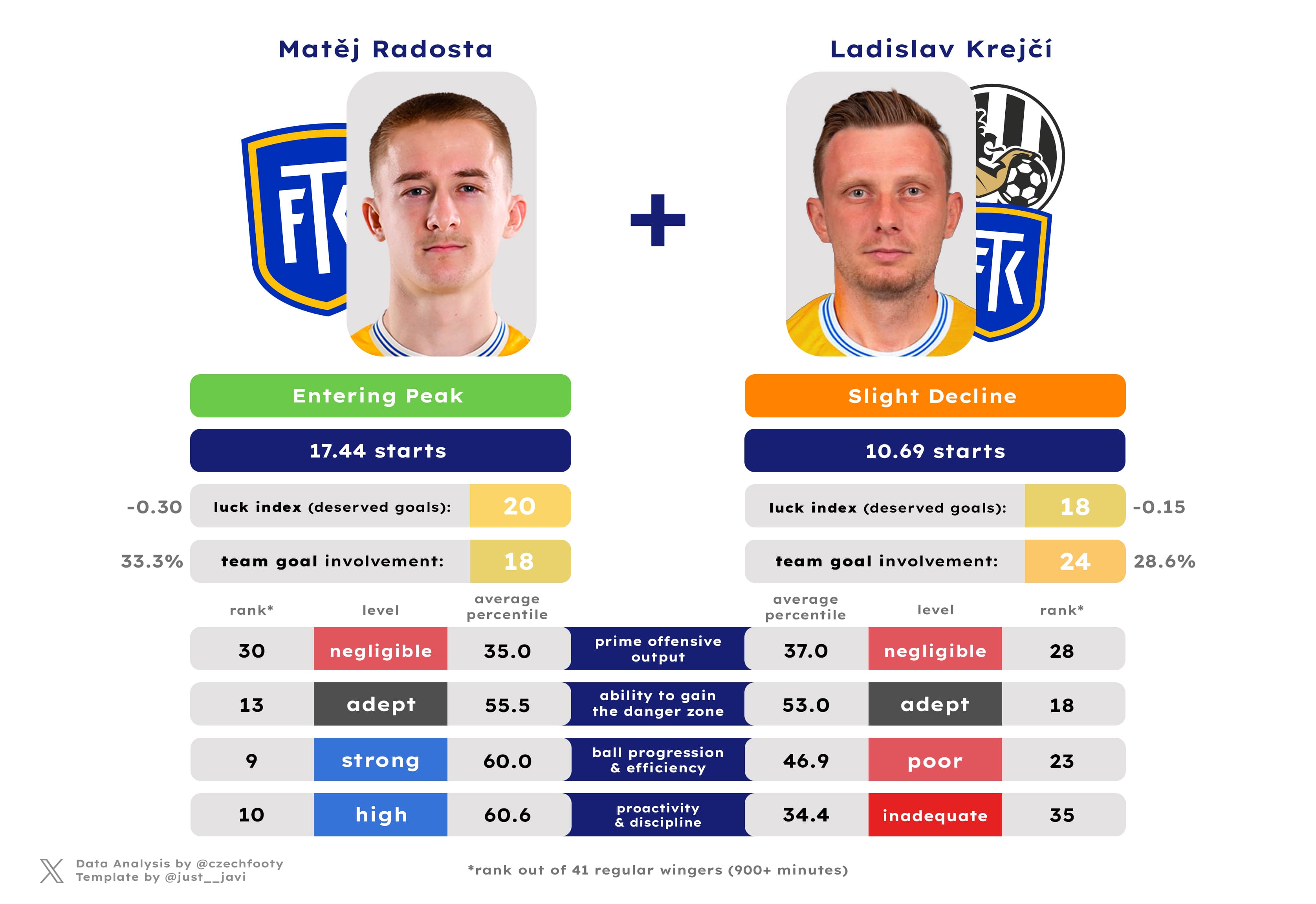 What’s funny is that despite arguably delivering less substance to Teplice now than in his previous campaign (61st overall percentile), the fact Trubač also delivered six goals (five of them vital) instead of four simply shines brighter for the outside world. If all goes well, the long-tenured midfielder should enter Teplice’s Top 10 in appearances midway through the season, and doing the same for goals isn’t out of the question either (needs 7 to separate himself from Jiří Pacenhauer). It would be a fitting farewell indeed, if it comes to it.