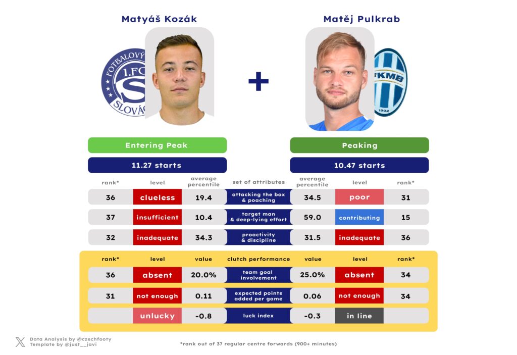 In theory, Pulkrab could at least replace the “fox in the box” set of skills Yasser offers. But going by his 24/25, even that would be a stretch. Pulkrab only produced 8 shots from inside the box in 10.5 starts (averaging the least inside-the-box xG per game) and exactly one penalty area entry. Kozák, for his part, produced 12 such shots in 11.3 starts (averaging the second least inside-the-box xG per game) and succeeded with 6 of his 29 attempted actions inside the box. It’d be hard to put together a more clueless duo of 24/25 box operators.