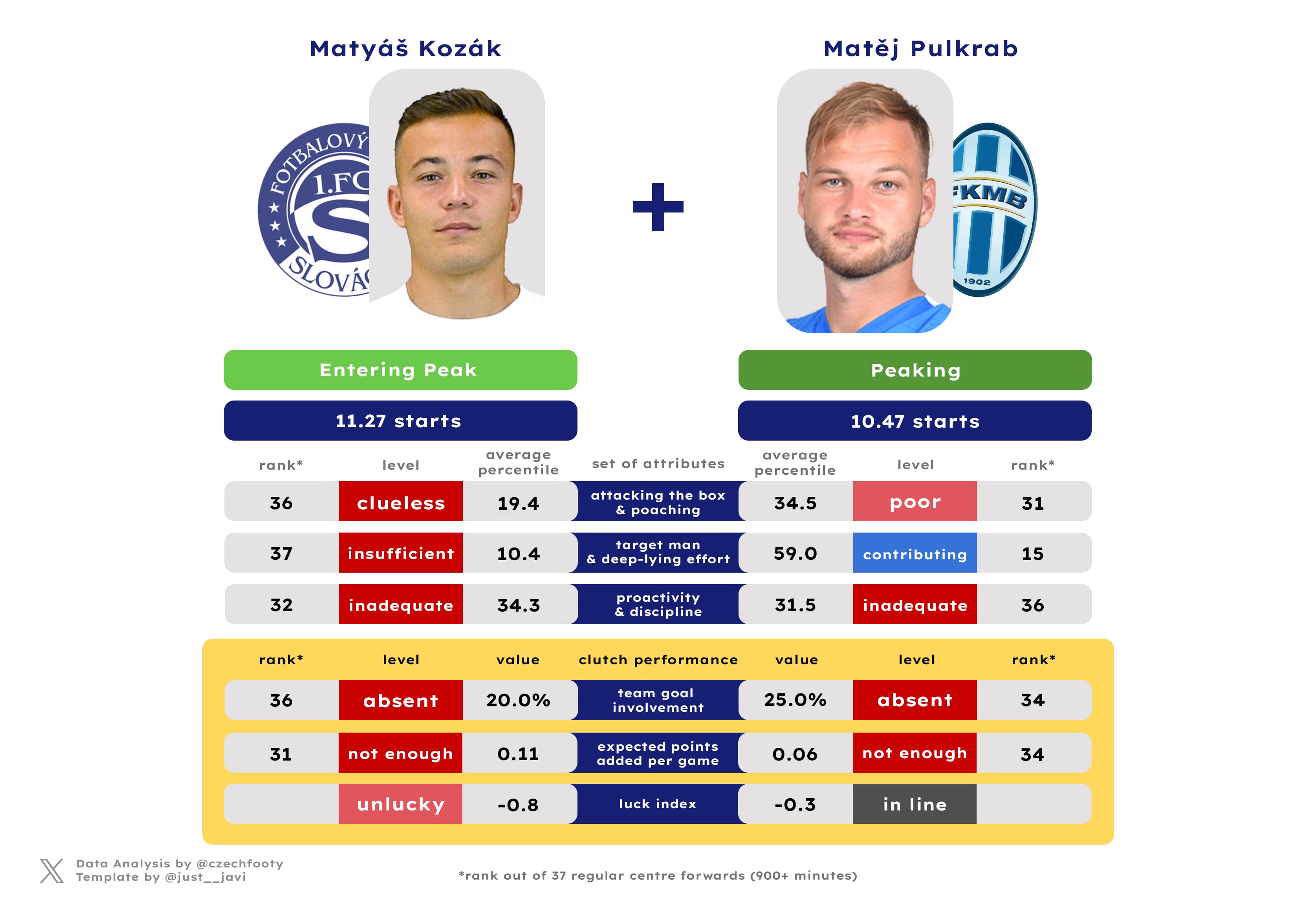 To be fair, Pulkrab does have a track record and a solid pre-season behind him, plus there were areas of his game where the small sample flattered him (e.g. expected assists, goal/chance-creating actions for teammates), but there’s no convenient spin for Kozák.