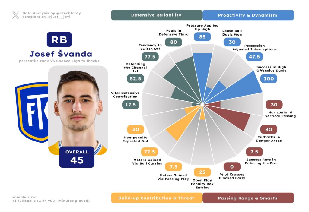 Finally, my favourite fullback to watch. Not the best one; but certainly one of the funnest. Josef Švanda would probably readily get called “non-Czech” these days, as he’s a very high-risk, high-reward type of a fullback we don’t tend to produce en masse. He does all the fancy stuff: beating his man 1-on-1 (possibly better than anyone outside of Diouf; he loves to poke the ball around you), pouncing on loose balls with some incredible flexibility, and operating in cutback areas. He’s one smart cookie, you see, as long as you don’t ask him to cross.