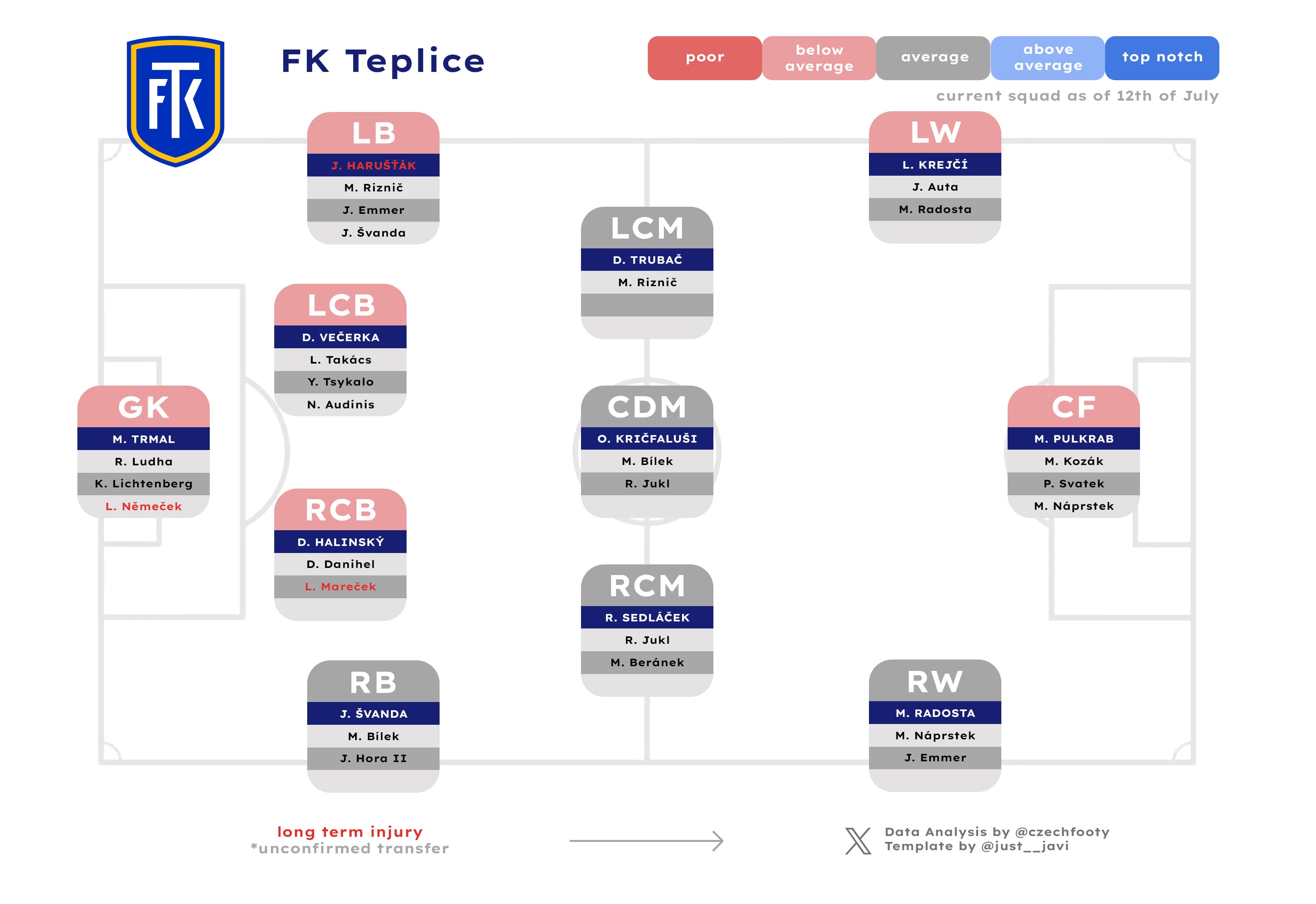 It doesn’t exist, almost by design. Frťala likes to flip between various 3ATB3ATB means 3-at-the-back, ie. any formation with three centre backs and wingbacks, or alternatively, five defenders. formations as well as 4-4-2 or 4-5-1, and that shall continue given that the entire pre-season mirrored this kind of chaos. The absence of a traditional left back and the abundance of healthy centre forwards could well see Teplice start in a 3-5-2, with Krejčí benched, right-footed Matěj Radosta switching to the left and Kričfaluši beginning in defence; like in the dress rehearsal, basically.