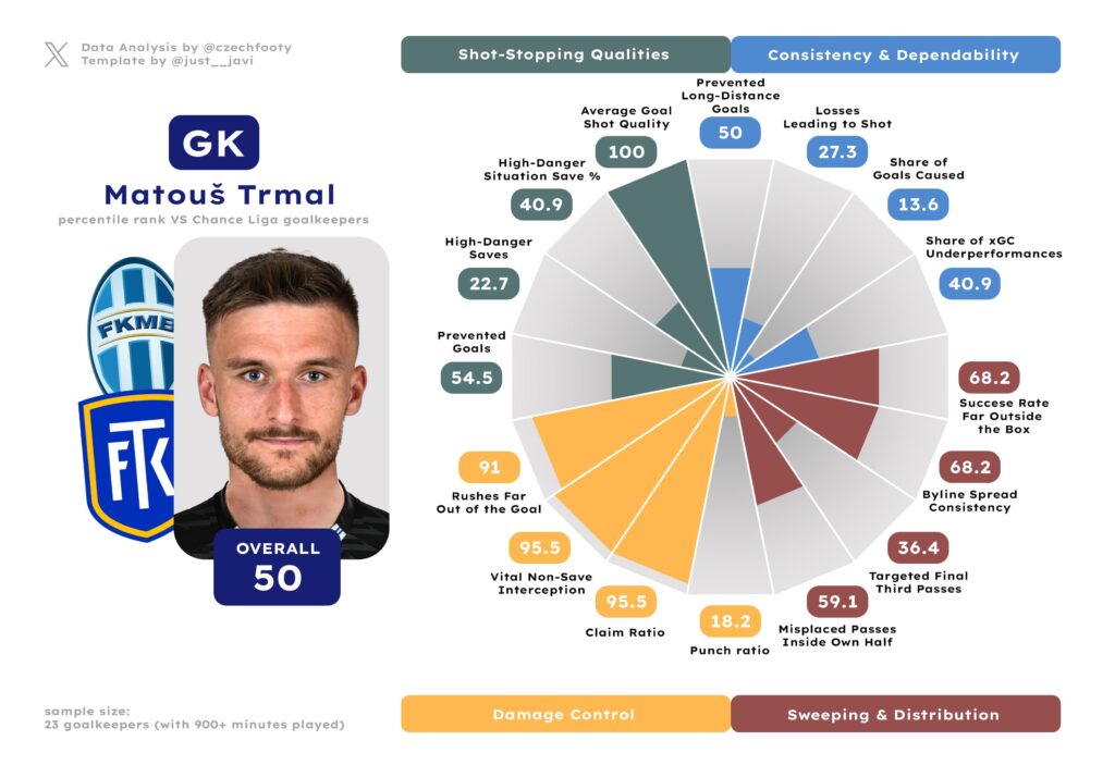 First up, it’s Matouš Trmal. He admittedly wasn’t great for Mladá Boleslav (leaking six soft goals), but he was mostly excellent for Teplice (leaking one such goal). After Richard Ludha and Luděk Němeček combined for 8.98 goals conceded above expectation, Trmal saved an extra 1.23 goals in their place — over a ten-goal swing. While Ludha also likes to come off the line and intercept plays in all sorts of ways, Trmal did so more effectively and reliably for both of his clubs in 24/25; only Zadražil was, on balance, more efficient in damage control.
