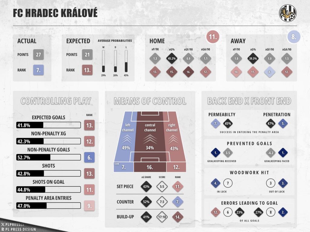 First-half overperformance has powered Hradec’s season even more so than their home overperformance. This was especially on display between Rounds 6-14 when ‘Votroci’ recorded 4 of the worst xG performances of the entire playing field (ranked 293rd, 294th, 300th and 301st), two greatest xP overperformances of the season (Sparta and Bohemians), only one loss, and no negative scoreline at half-time. Across those 9 rounds that very much made their autumn, Hradec’s first-half score reads 9:4 despite the minus-2.61 xG differential.