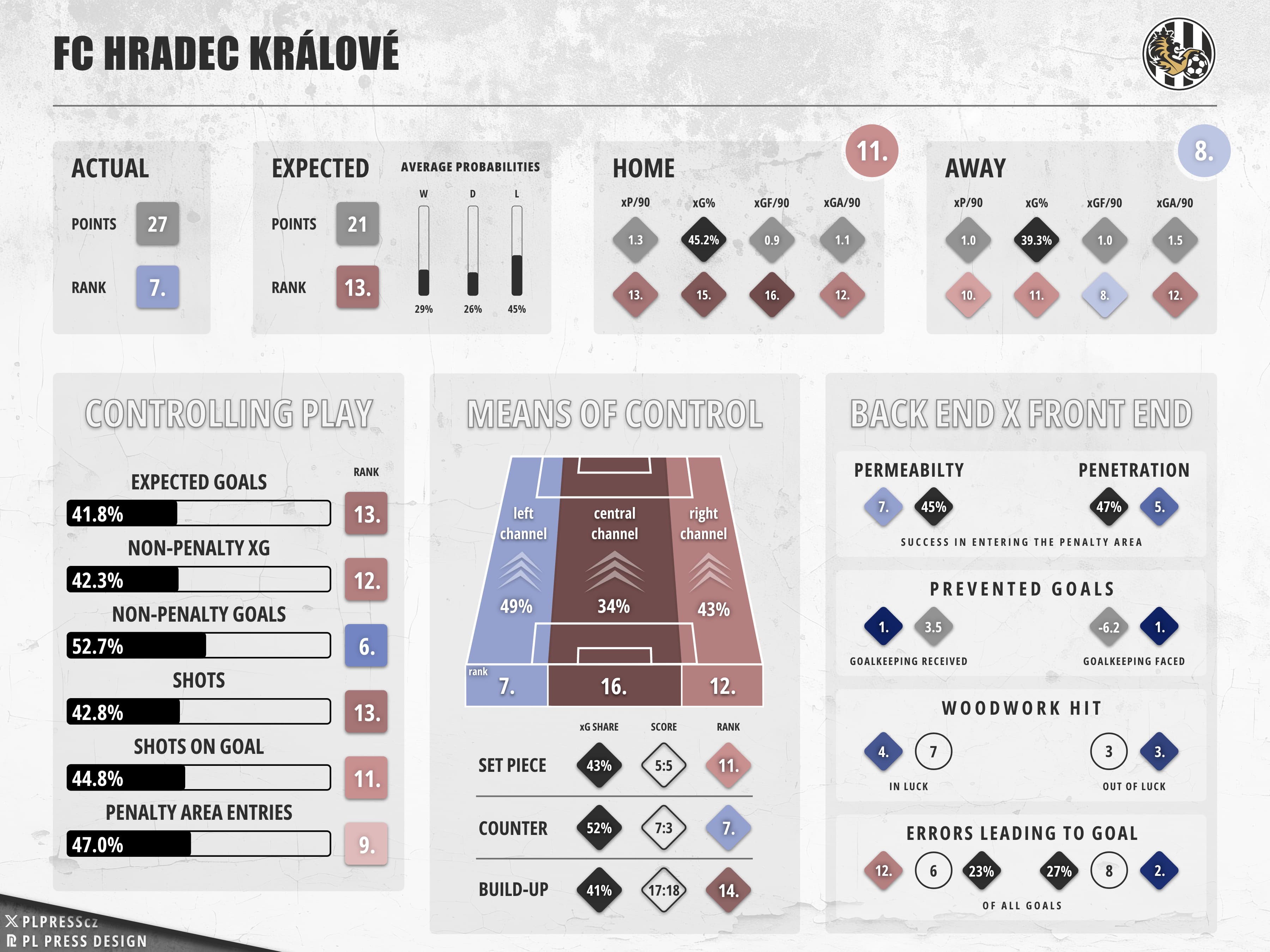 This phenomenon was the most visible at home where Hradec somehow posted the worst average xGF of all teams (0.94), yet authored 63.6% of all goals Malšovická aréna saw this past fall (4th best home ratio in the league). With the 5th worst defence, this shouldn’t be a thing.
