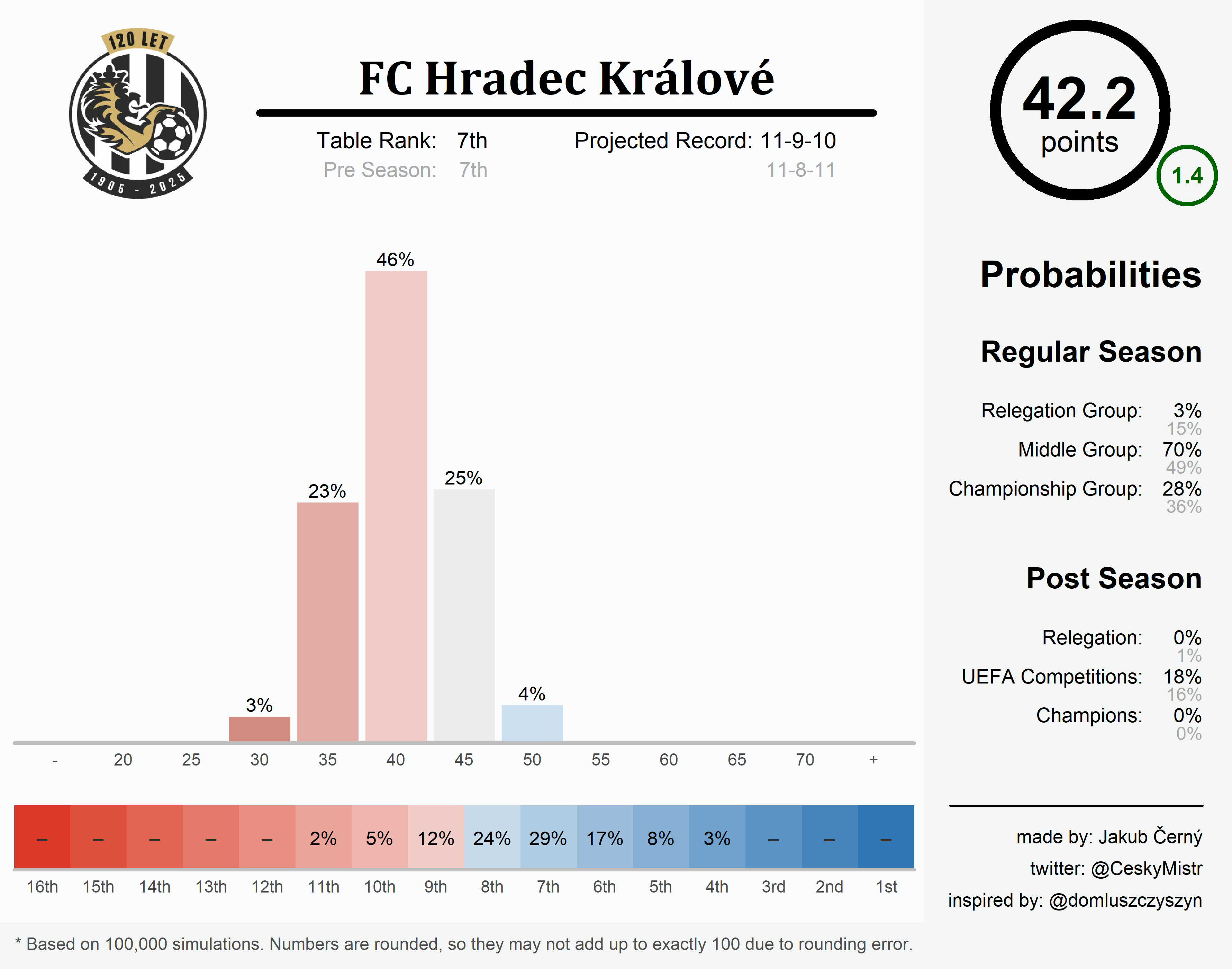 Same place, same amount of wins, just one draw instead of one loss. Hradec’s summer projection was nearly spot on, and that’s largely not good news for ‘Votroci’. Through everyone else’s movement up and down, FCHK can almost be sure of one thing — landing in the middle group — which was decidedly not the aim. While the 28% likelihood of a Top 6 placement is not nothing, both Karviná (67%) and Liberec (83%) boast a substantially higher chance, with Olomouc lurking not far behind (22%), so a lot would have to go Hradec’s way for them to achieve their goal. Karviná’s collapse alone, the safest bet of all, may not suffice.