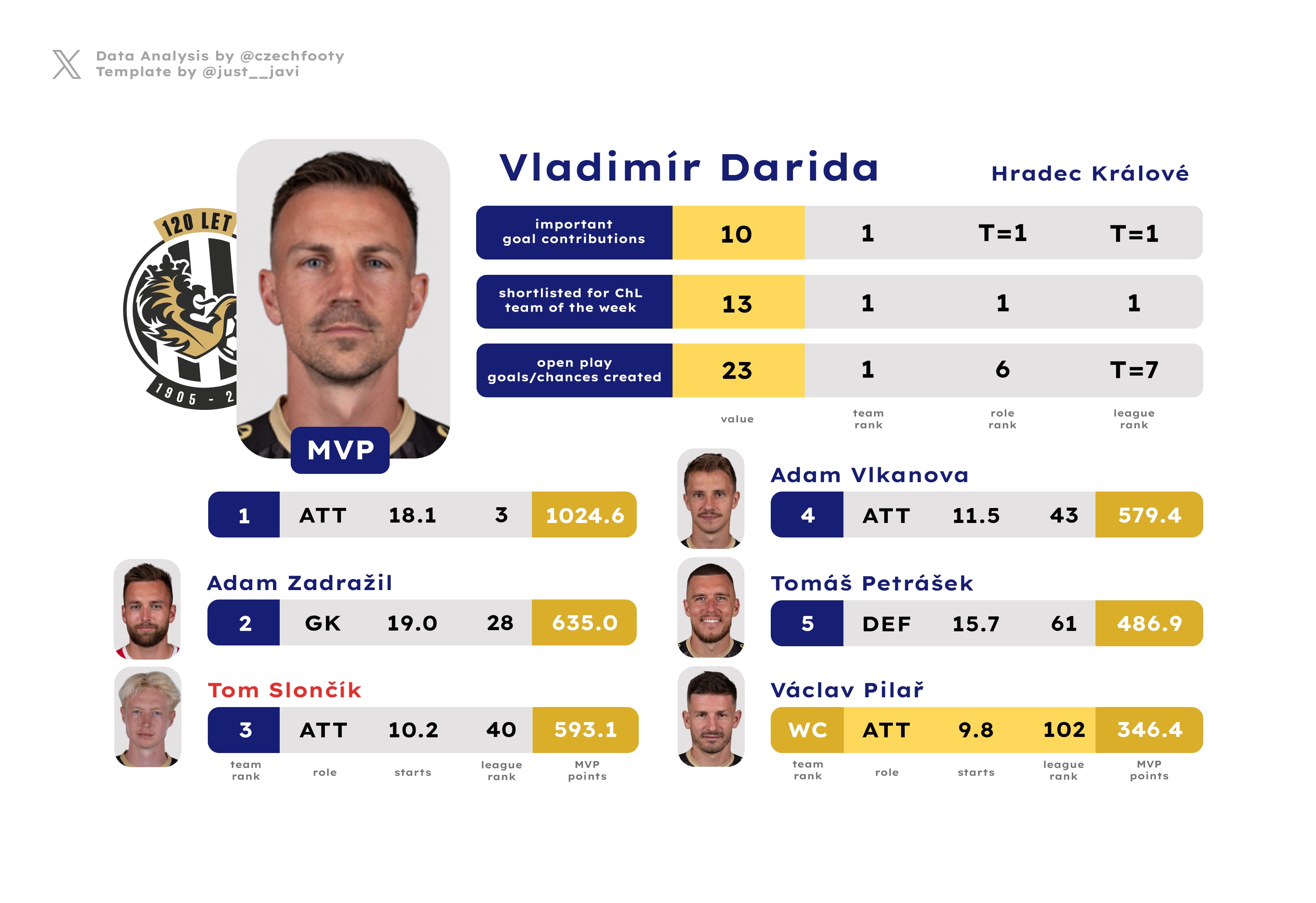 Ultimately, I don’t think there’s that much separation between Tom Slončík and Darida, or even him and Adam Vlkanova who also has got six important points to his name, and has contributed to a fine 11 goals. Adam Zadražil, meanwhile, has only got himself to blame as he leads the league in prevented goals (3.5) yet also in grave errors leading to goals (4; costing Hradec nearly five points in the standings per EPA). In a similar vein, Tomáš Petrášek was — for the best part — a stud defender and a dangerous offensive threat, who’s all the same implicated in 8 conceded goals and was suspended at two points of the season already.