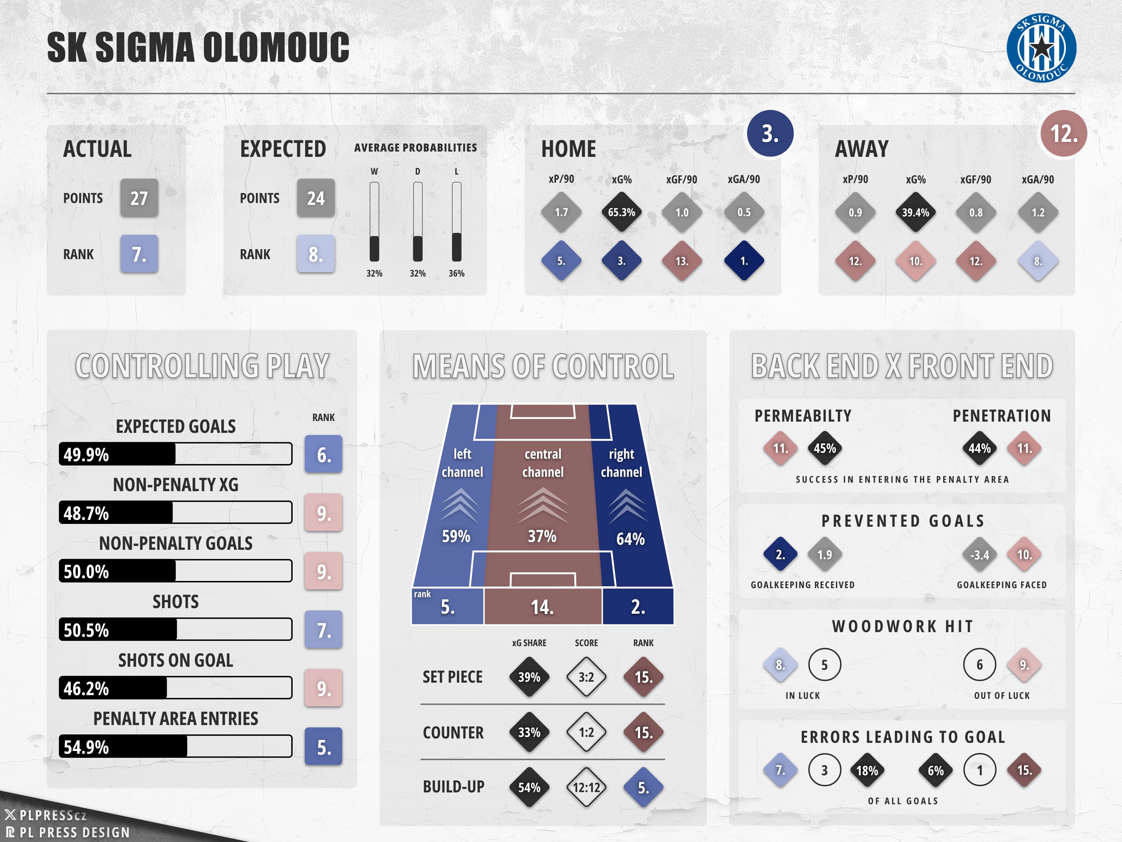 Olomouc still have six home stands to go on the regular season and the line-up is frankly not the most frightening: Hradec, Plzeň, Bohemians, Karviná, Boleslav, Slovácko. That’s excellent news, because if something went (better than) according to plan for Sigma this past autumn, it was their showings at Andrův stadion. Slavia, Sparta, Jablonec and Liberec all combined for a measly 2.76 xGF in Olomouc, setting up the scene for Sigma’s splending average of two points per home game (Top 3 mark) and an even more formidable 80% share of all goals scored at ‘Andrák’ (second Slavia are “only” responsible for 75.8% of all goals Eden has seen).