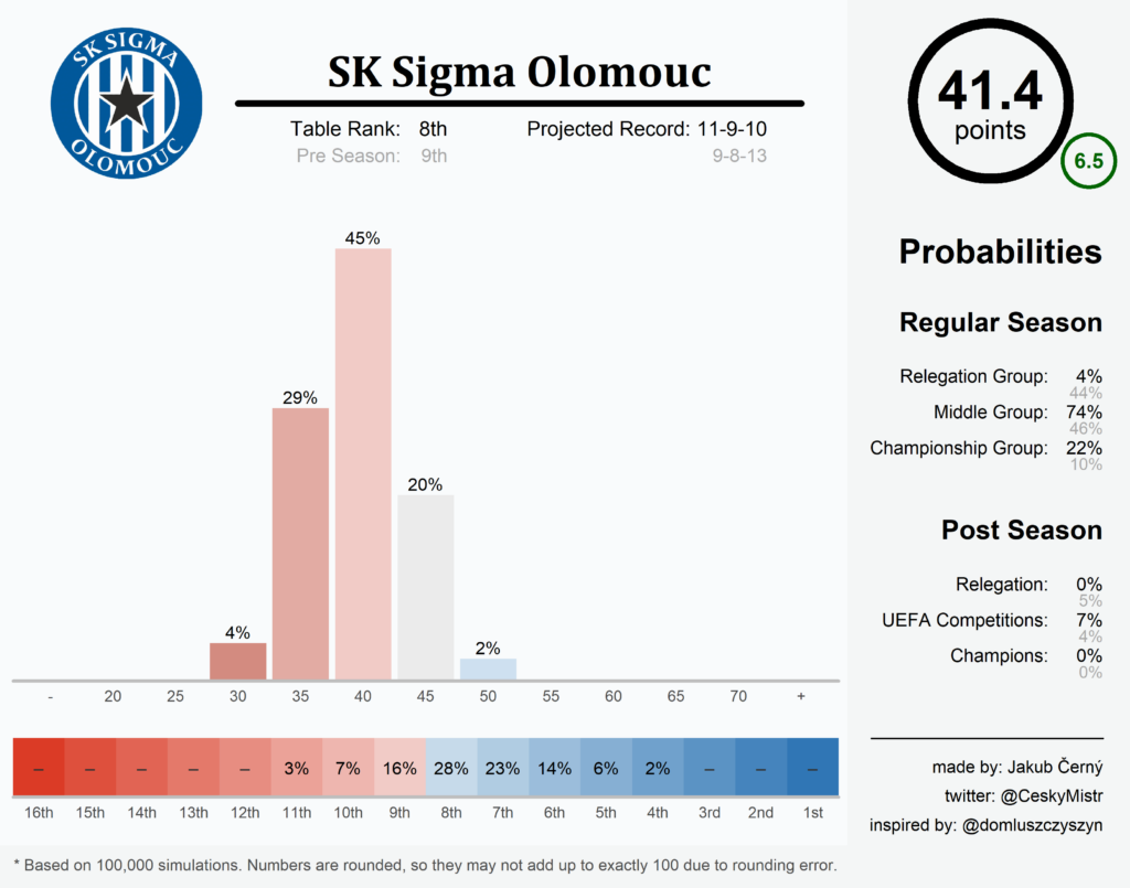 Despite earning 43 regular-season points where 38.2 were projected for them in summer 2024, Olomouc didn’t get a glowing forecast a year later. Courtesy of the twin departure of Jakub Pokorný and Filip Zorvan, coupled with the longterm injury to their talismanic shooter Jan Kliment, Sigma were suddenly looking at 35 projected points and a greater likelihood to go down than return to UEFA competitions. In that light, slashing their prospects of even forming the bottom 6 to a mere 4% must be seen as success, much like Olomouc being on track to more or less repeat their 24/25 regular-season feat (points-wise). They’ve done OK.