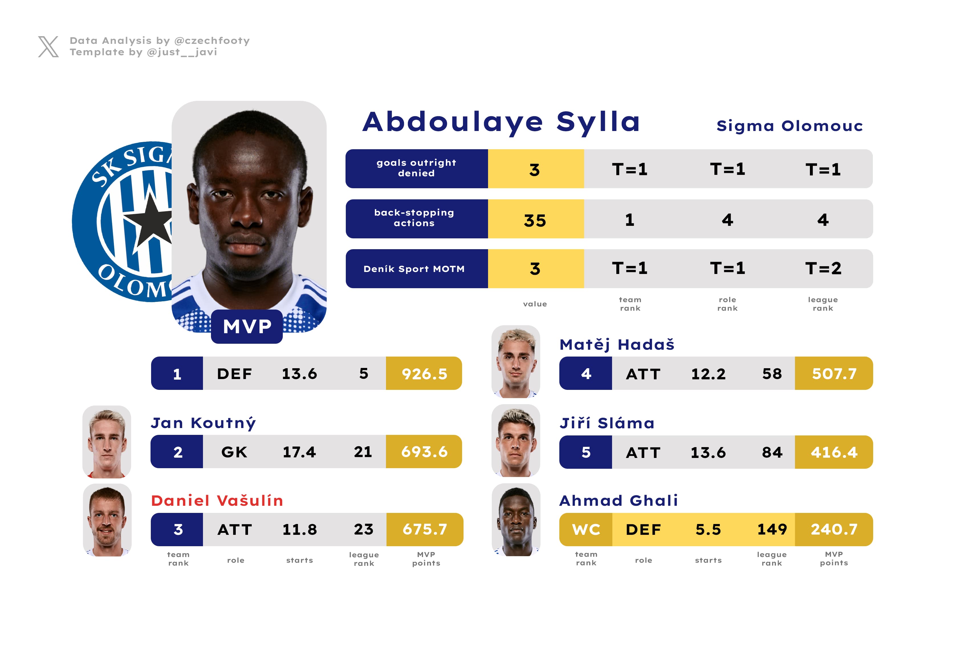 The peculiar thing about the two Sigma MVP frontrunners is that they don’t tend to fuck up often, but when they do, it either comes in bunches (for Aboulaye Sylla), or it properly stings (for Jan Koutný). One more aspect: our overall impression of both is heavily influenced by their (sometimes sub-par) continental performances which naturally don’t factor in here.