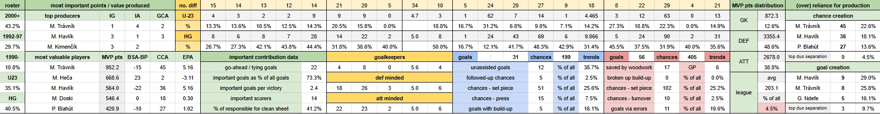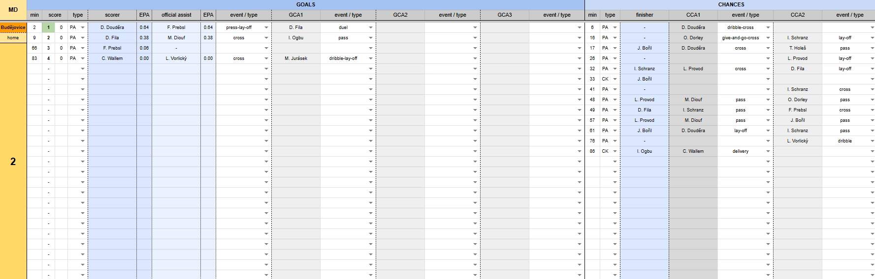 It’s still true, after all, that I watched all the games last season even while abroad (hence relying on Wyscout downloads in the absence of VPN-proof O2TV) and did even more detailed tracking of game events than the year before. To give you a rough idea, I have this sort of data on both offensive and defensive side of the game for every game of each team. For the first time in 2022/23, I specifically tracked chances generated off of forced turnovers and credited creators for chances left unfinished not through their own doing. In 2023/24, I zeroed in on involvement in goals/chances created/allowed, to speak further to one player’s positive value in build-up or, conversely, negative value in defending his own zone. In 2024/25, I’ve included more contribution types for variety and focused on over-reliance on certain chance/goal creators, mostly just playing around the edges of a database I was now happy with.