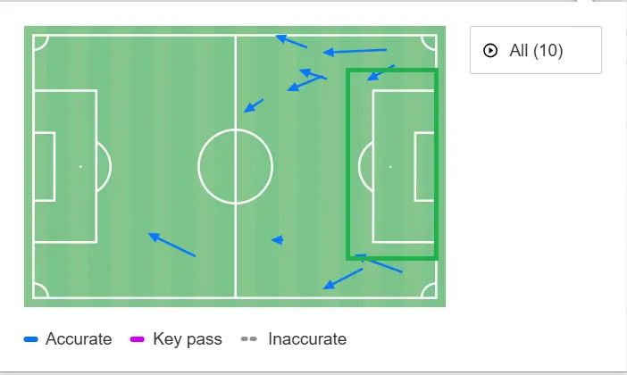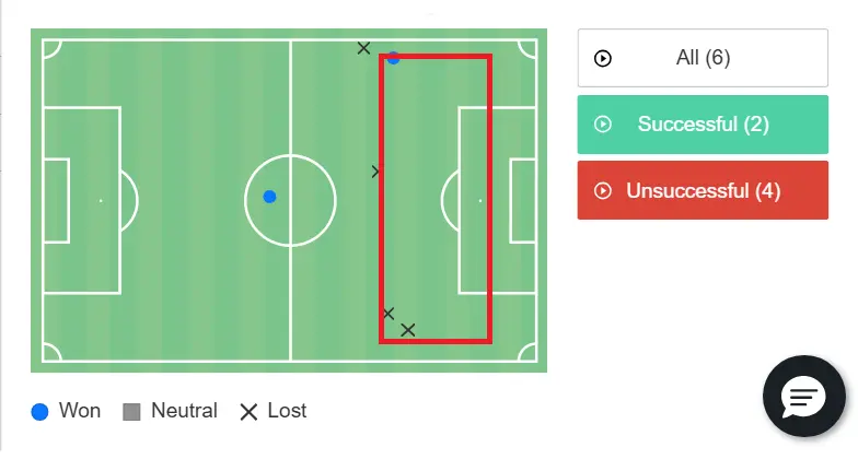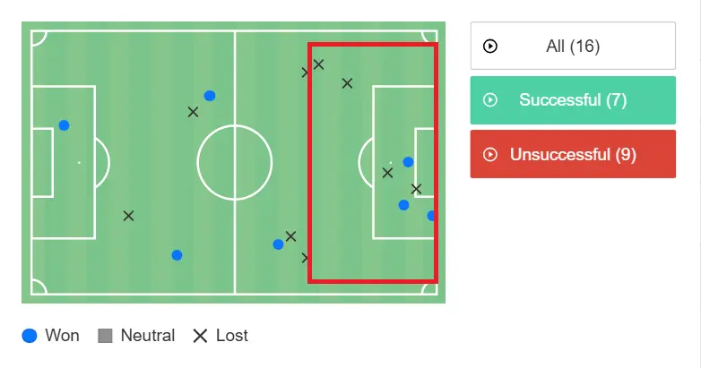 Previously, I was only tracking a player's success rate in aerial duels up top, in roughly this vast an area of influence. Now I'm also concerned about one's success rate inside his own penalty box; something that is a big part of the appeal of, say, Tomáš Chorý (winning 11 of 16 duels at the back).