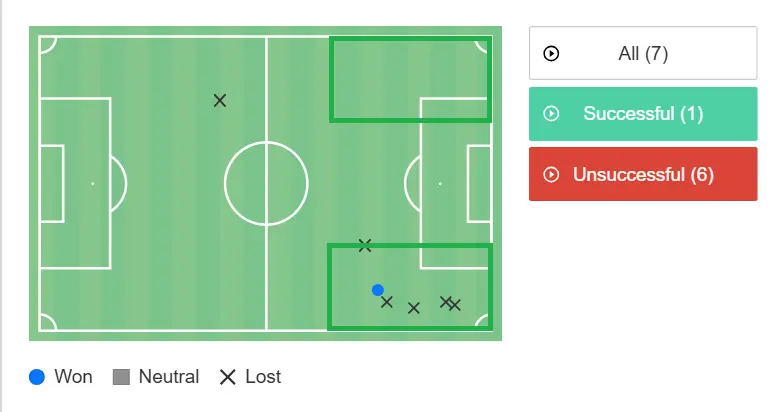 Here, I am severely limiting the space where an offensive duel needs to occur for it to count. It roughly corresponds to this area, and for two main reasons. Firstly, the relevant grouping of metrics is called "gaining the danger zone" and so this stat is supposed to capture the "entering" phase rather than what happens inside the box itself. Secondly, a great winger still needs to primarily dominate the channel; so this is basically a mirror to fullback's 1v1 defending of his own channel.